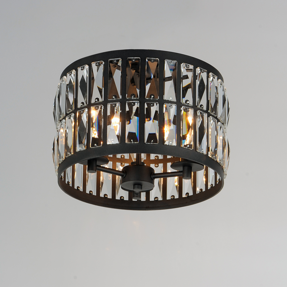 Rectilinear Beveled Crystals bejewel a Matte Black frame creates stark contrast to this radiantly prismatic display of light. The bound crystal is fixed to the frame to reduce time spent dressing the fixture.
