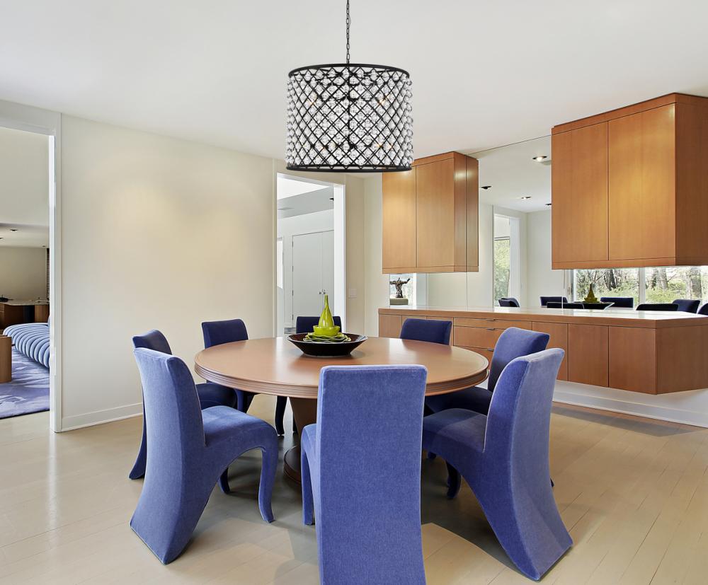 Modern simplicity meets organic beauty in the breathtakingly unique Madison collection. Hand-polished, multifaceted clear crystal spheres shimmer like dewdrops in a circular forged-iron grid with a golden-iron, Matte Black, or polished-nickel finish. These airy pendant lamps will brighten up a kitchen, dining room, foyer, or stairwell in an explosion of reflected light.