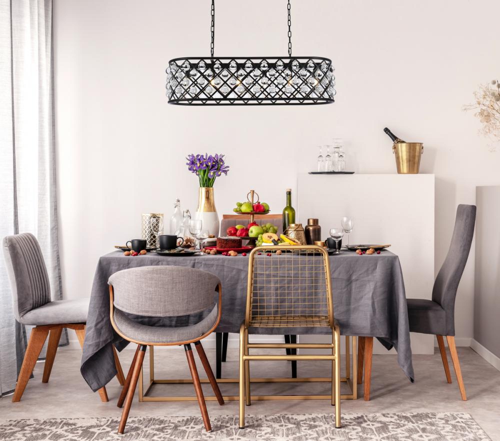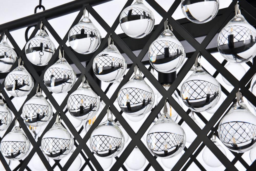 Modern simplicity meets organic beauty in the breathtakingly unique Madison collection. Hand-polished, multifaceted clear crystal spheres shimmer like dewdrops in an oblong forged-iron grid with a golden-iron, Matte Black, or polished-nickel finish. These airy chandeliers will brighten up a kitchen, dining room, foyer, or stairwell in an explosion of reflected light.