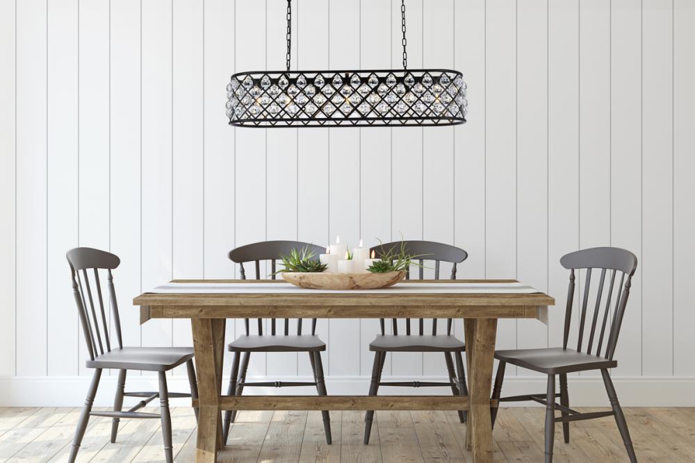 Lamp features a length of 50 inches, a width of 13 inches, a height of 15 inches, a minimum hanging length of 21 inches, a maximum hanging length of 75 inches, and requires 7 candelabra bulbs