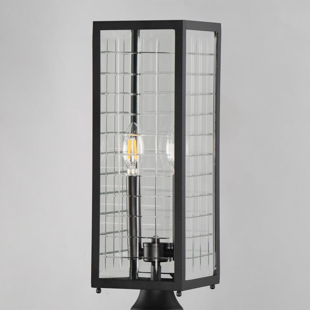 A simple square-framed lantern features deep etched squares on Clear glass, creating a captivating array of refracted light. Constructed from die-cast aluminum and finished in Matte Black, the design blends classic elements with a refreshing, modern approa