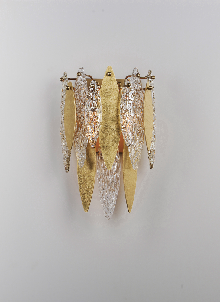 Hand-formed glass petals of Clear and Champagne-tint suspend from a tiered frame of gold and accented with petals of solid metal finished in Gold Leaf. Numerous candelabra sockets are strategically placed within the fixture to create glimmer and elegance t