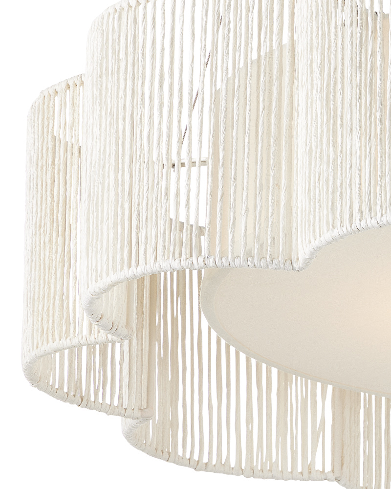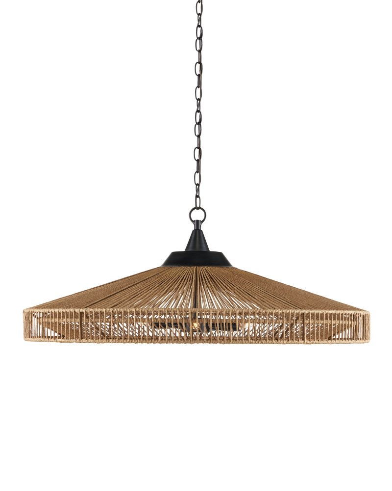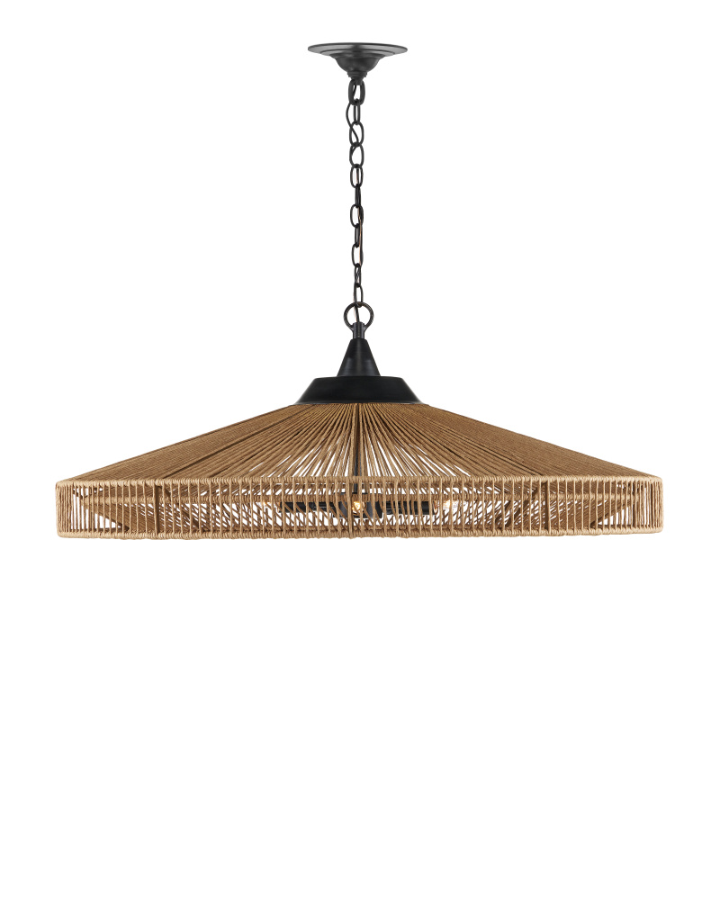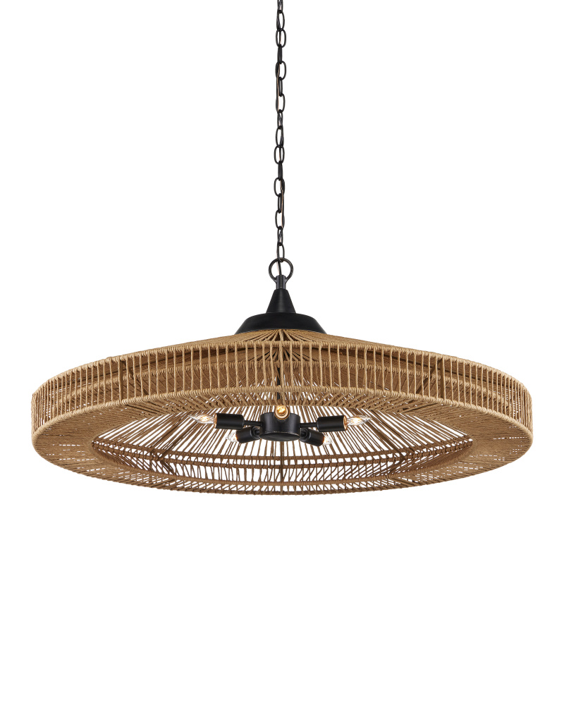 The Maldives Chandelier is made of wrought iron in a mix of satin black and khaki finishes to make this fixture a shoe-in for a black and natural style approach. The rope-like cage that surrounds it, made of Kraft paper twine, is woven to the frame in two layers, the one closest to the light source more concentrated to diffuse the light. The rope chandelier is fitted with five bulbs to make it a luminous fixture. Adjustable from 19" to 87" with use of included chain/rod kit/cable. If your space calls for a longer drop, additional chain/rods/cable is available for purchase.