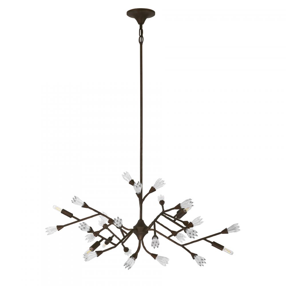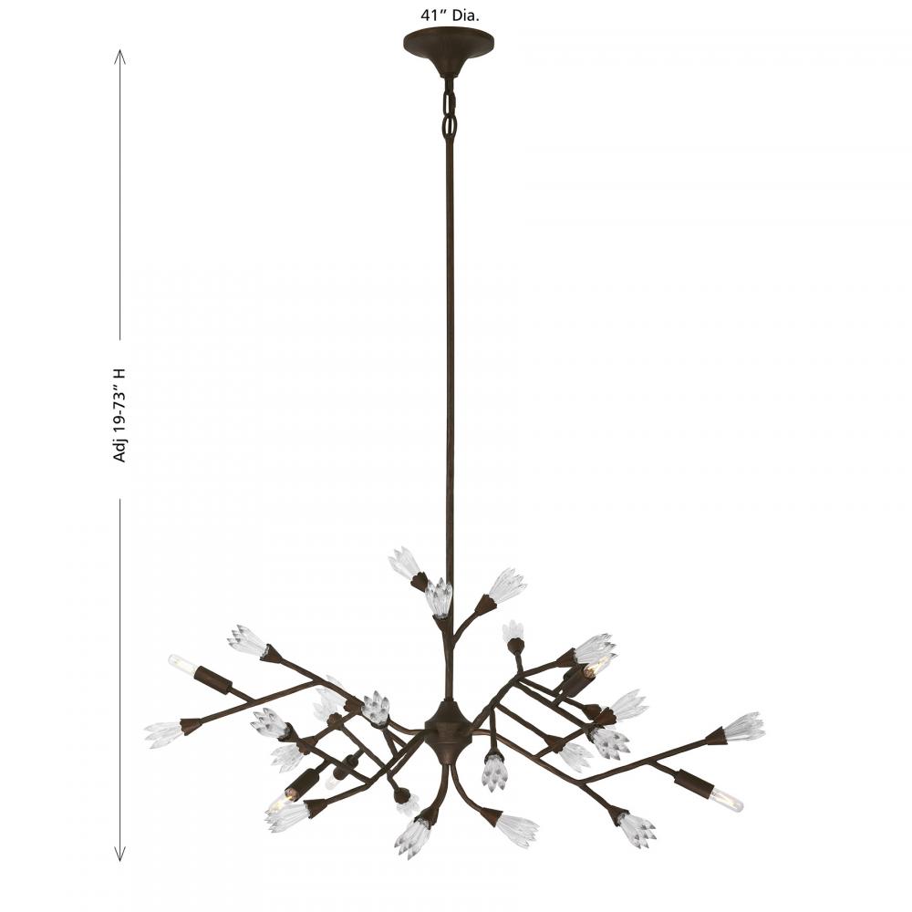 The organic meets the glamorous in the Savoy House Malinda 6-light chandelier, which was designed by award-winning interior designer and TV host Breegan Jane. Boldly textured metal branches hold faceted crystal spears that blossom forth like edgy flowers. It is all finished by hand in Bark, a dark bronze finish that imparts texture and intrigue. Malinda is 41" in width and has an adjustable height ranging from 19" to 73". It uses six candelabra size bulbs of up to 60 watts per bulb. Bulbs not included. Comes with four 12" downrods and one 6" downrod.