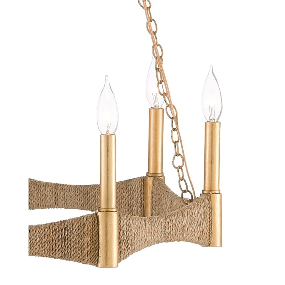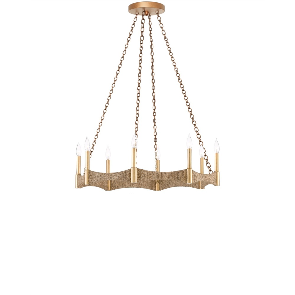 Our Mallorca Chandelier has a wavy profile. The band that connects the eight lights is made of wrought iron wrapped in Abaca rope. The bulbs that illuminate this rope chandelier are set on luminous rods in a dark contemporary gold finish. Adjustable from 20" to 72" with use of included chain/rod kit/cable. If your space calls for a longer drop, additional chain/rods/cable is available for purchase.