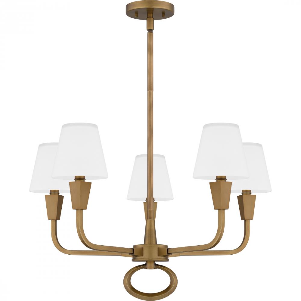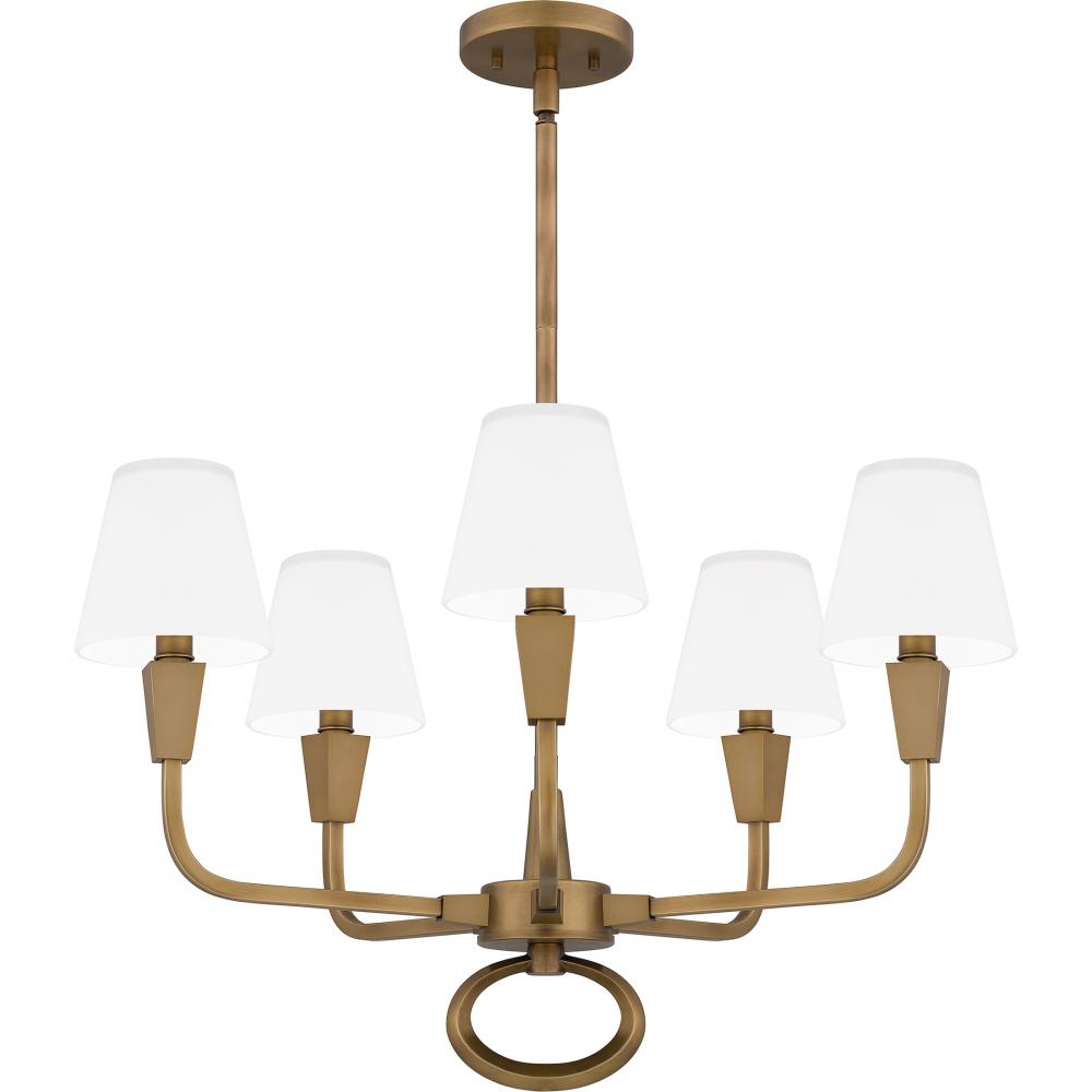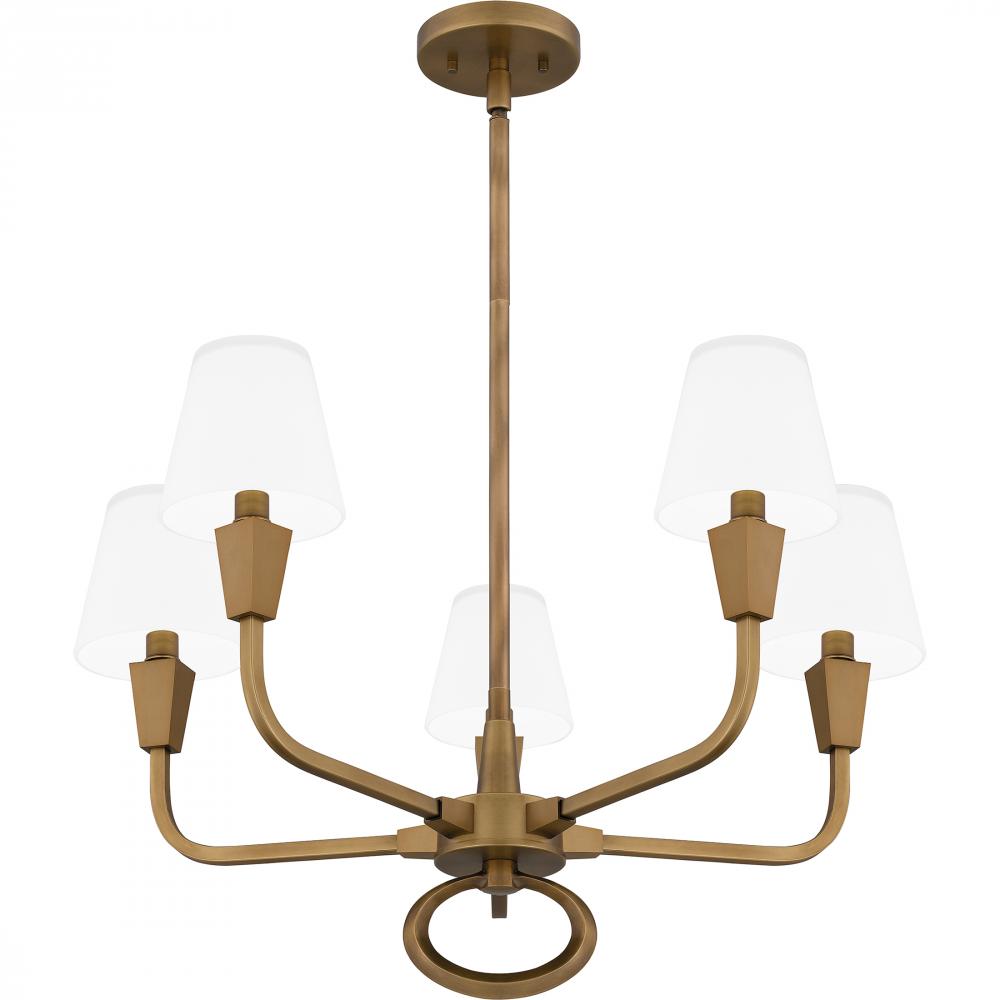 Mallory takes a modern approach to the classic chandelier silhouette. Etched painted white glass shades rest atop geometrical arms for a bold, slightly masculine feel. A weathered brass finish completes the look, adding a subtle touch of shine. Hang this h