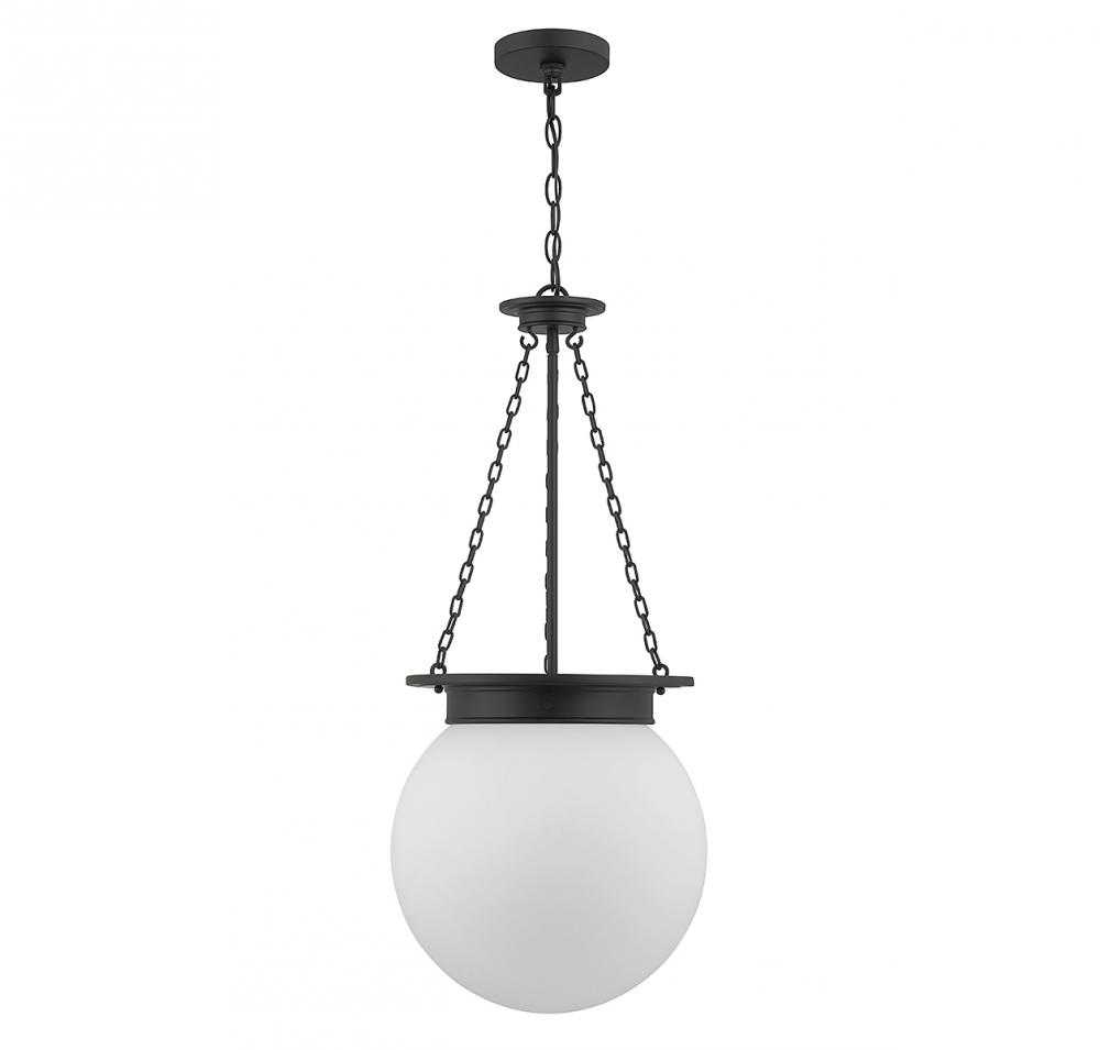 The Savoy House Manor 3-light pendant proves that a classic style can be stunning! An orb-shaped shade of white opal glass hangs down from an understated structure with timeless details. Finished in matte black. Manor is 31” in height and 13.5” in width. It uses 3 candelabra size bulbs of up to 60 watts per bulb (bulbs not included).
