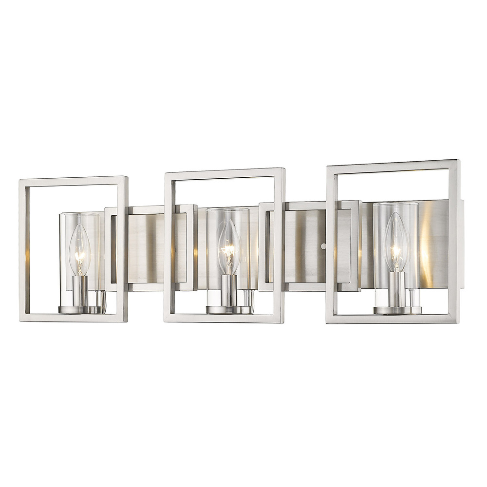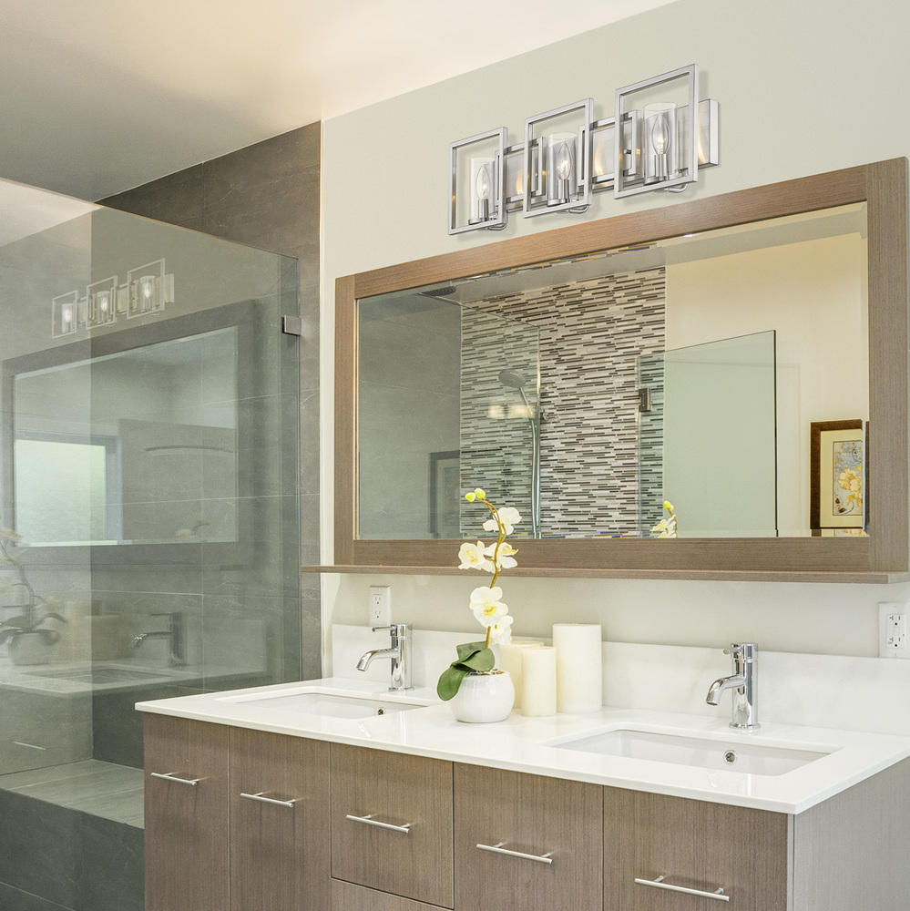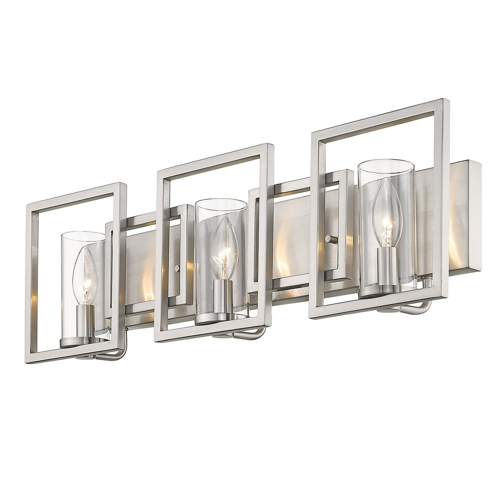 Sleek angles and a geometric form make an ultra-modern statement in the Marco collection. The series is offered in multiple finishes that heighten the light airy look. Clear Glass cylinders surround the stately silhouettes of candelabra bulbs. The Marco bath vanity provides ample light with contemporary flair.