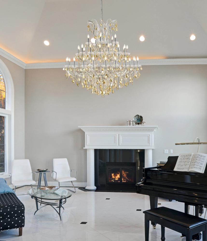 A heavenly high point to your home, Maria Theresa collection pendant lamps are ablaze with hundreds of resplendent crystals. Copious strands of sparkling clear or golden-teak crystals dangle from elaborate tiers of glass-coated steel arms in your choice of a chrome, gold, golden-teak, white, or black finish. An imperial favorite for the stairwell, dining room, or living room.