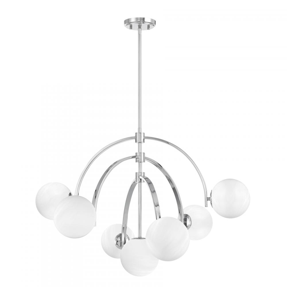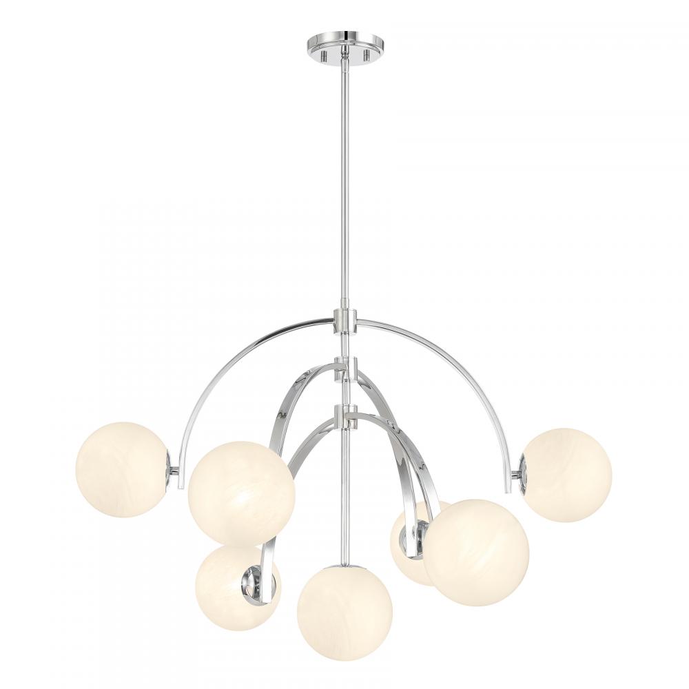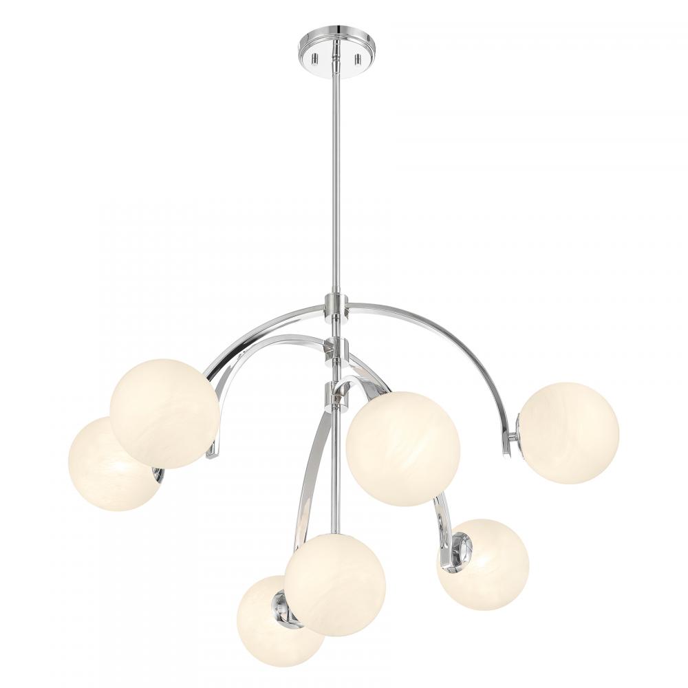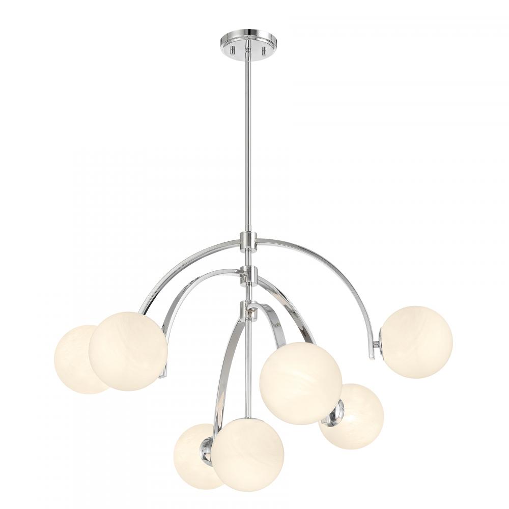 Create a lighting look all your own with the Savoy House Marias 7-light chandelier. It brings intriguing Art Deco inspired style with three adjustable arching arms that hold orbs of eye-catching strie glass. Move the arms around to change things up any time you want! Chrome finish. Marias is 32" in width and has an adjustable height ranging from 22" to 76". Comes with four 12" downrods and one 6" downrod. Uses seven candelabra size bulbs of up to 60 watts per bulb. Bulbs not included.