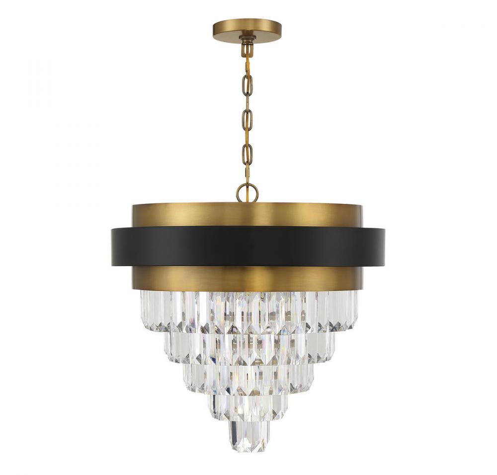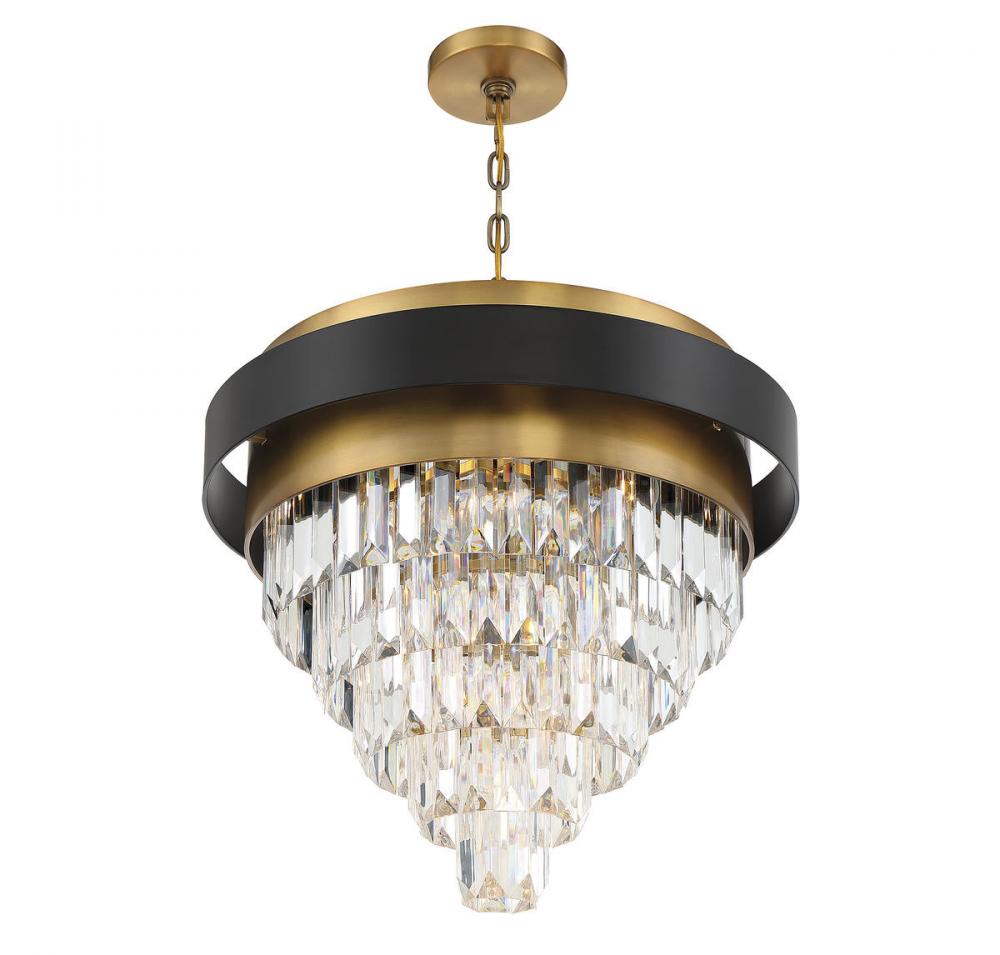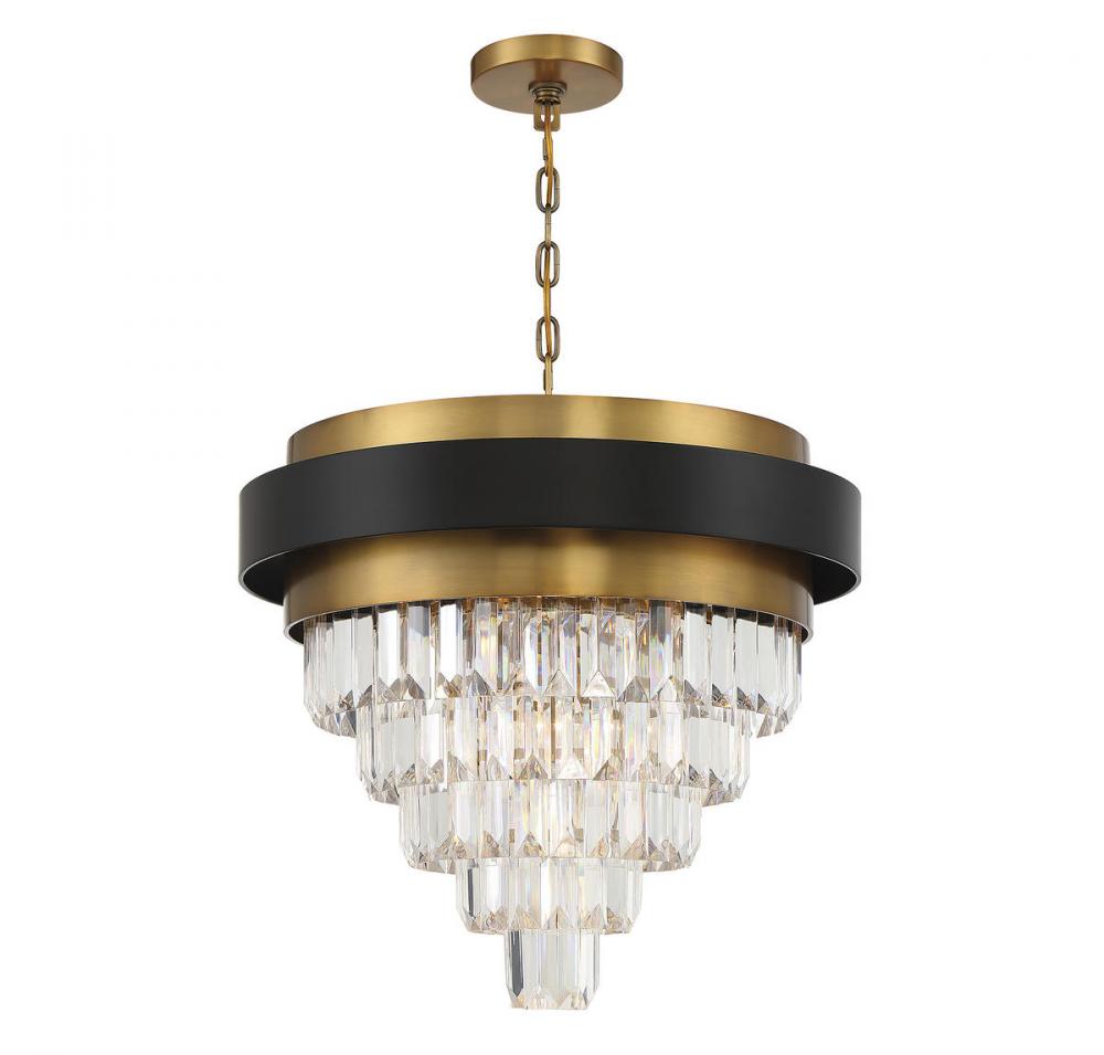 Tiers of shimmering faceted acrylic gems cascade down to create a gorgeous look in the Savoy House Marquise 4-light chandelier. At the top, its band of matte black and warm brass adds a dose of classic, timeless glamour. Marquise truly is fine jewelry for the home. This chandelier is 23" in height and 24" in width. Uses four standard size bulbs of up to 60 watts per bulb. Comes with 120" of chain and 144" of cord.