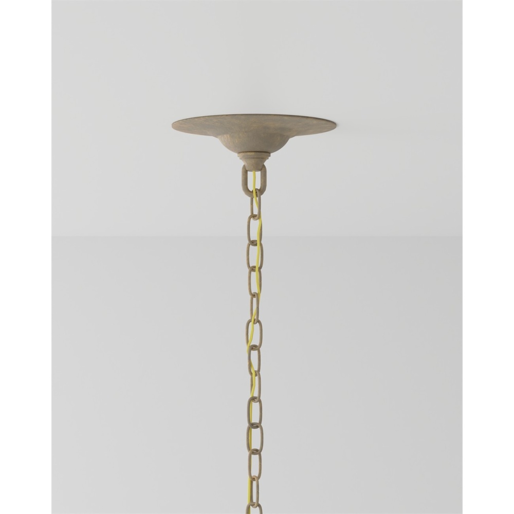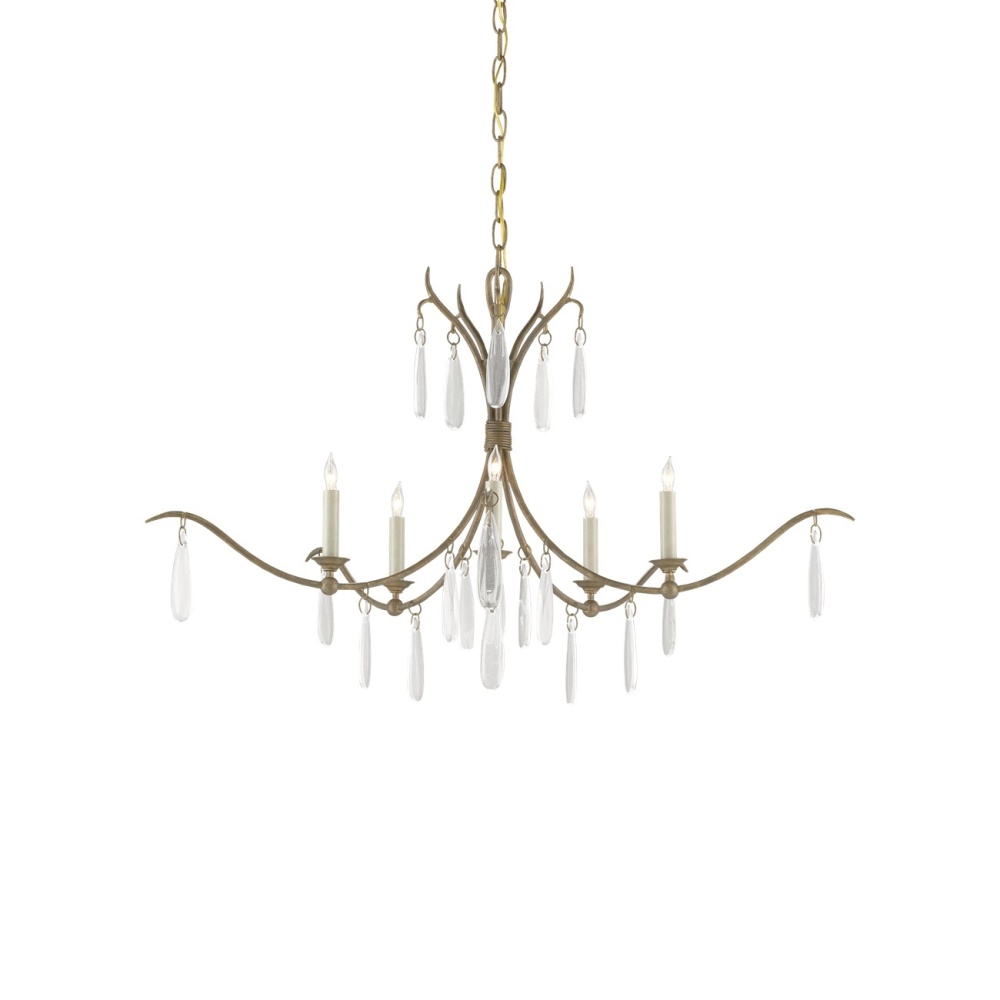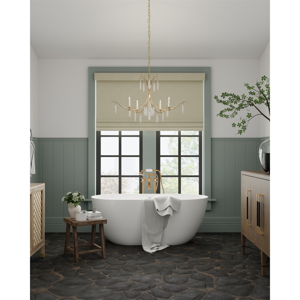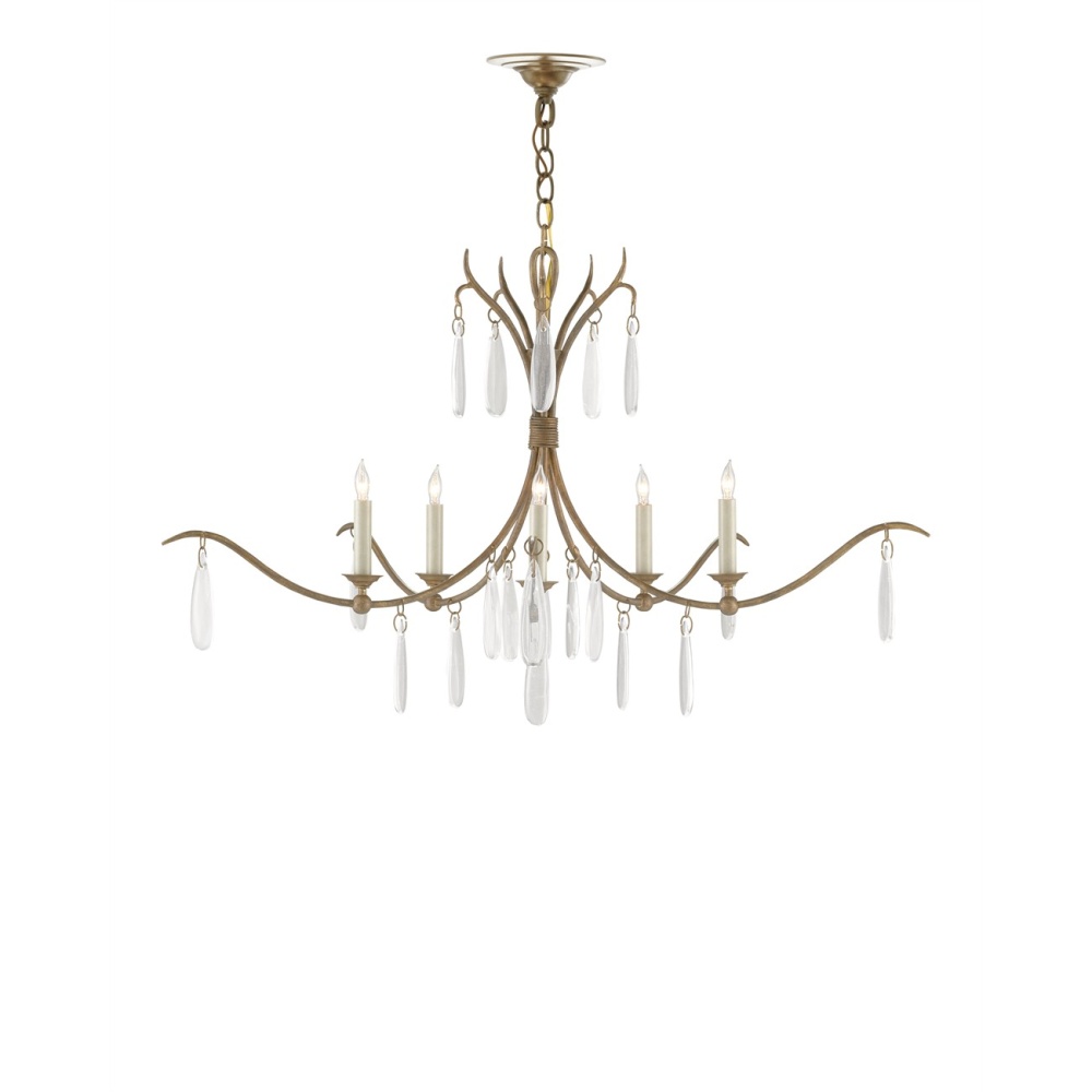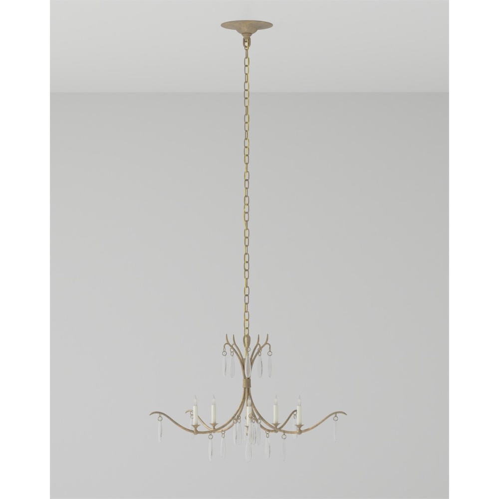 The Marshallia Small Chandelier, made of wrought iron in a rustic gold finish, has slender arms dripping with faux rock crystal pendants. A design detail of note is how the candle-sleeves for the five bulbs are unusually slender, which enhances the delicacy of this traditionally beautiful gold chandelier. Adjustable from 30.5" to 98.5" with use of included chain/rod kit/cable. If your space calls for a longer drop, additional chain/rods/cable is available for purchase.