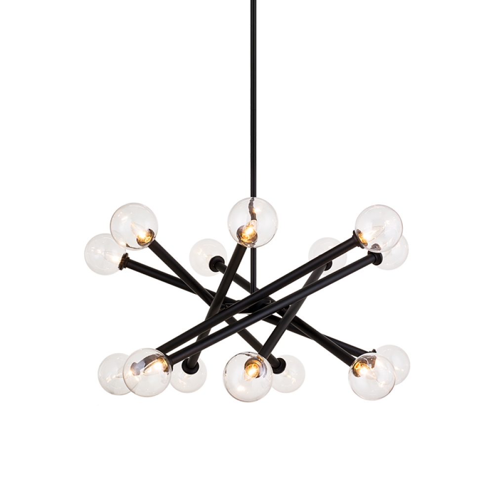 Matchstix chandelier will be a dramatic addition to any room. Modern movement in the crossing bar design will be a signature piece. Available in Aged Gold Brass or Black with either Clear or Opal glass.