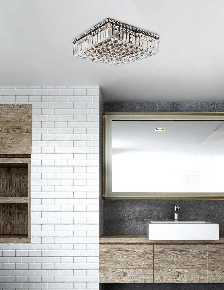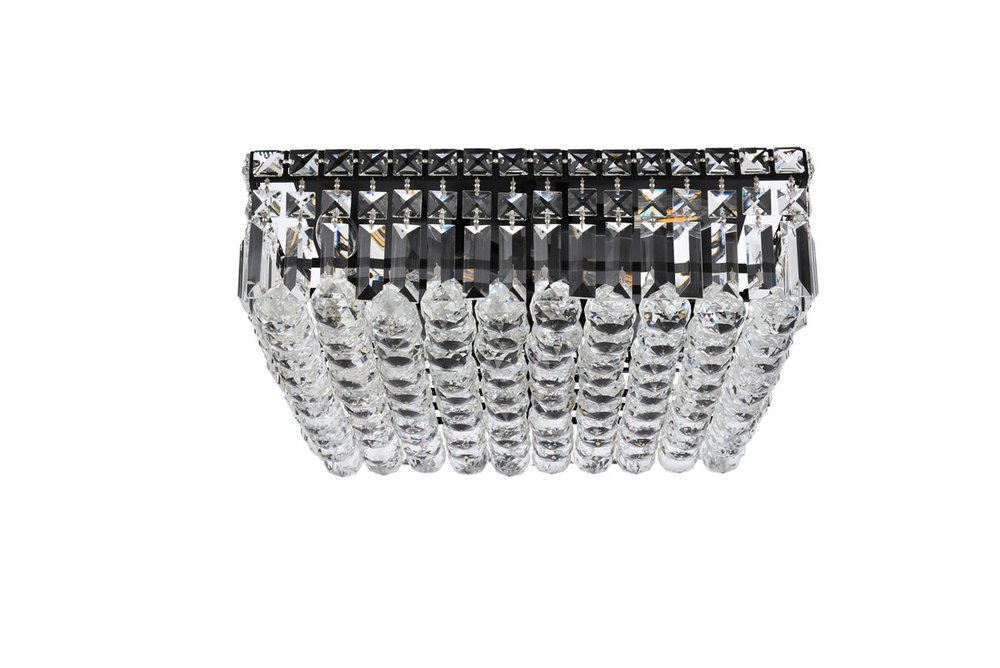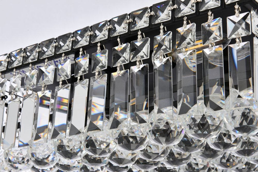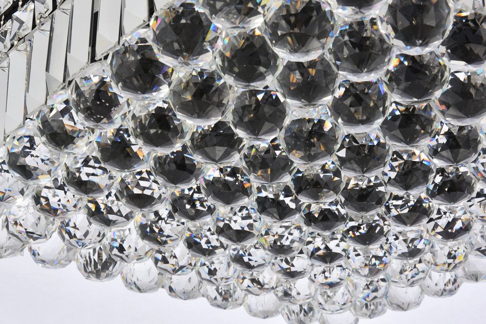A riot of shapes and textures, Maxime collection flush mounts sparkle in a mosaic of crystal tiles. Square and rectangular precision-cut crystals form the flamboyant exterior while faceted crystal balls create a bubbled effect for light to shine through beneath. Available in a black or chrome finish with clear crystals, these lamps are a luxurious addition to a kitchen, stairwell, foyer, or living room.