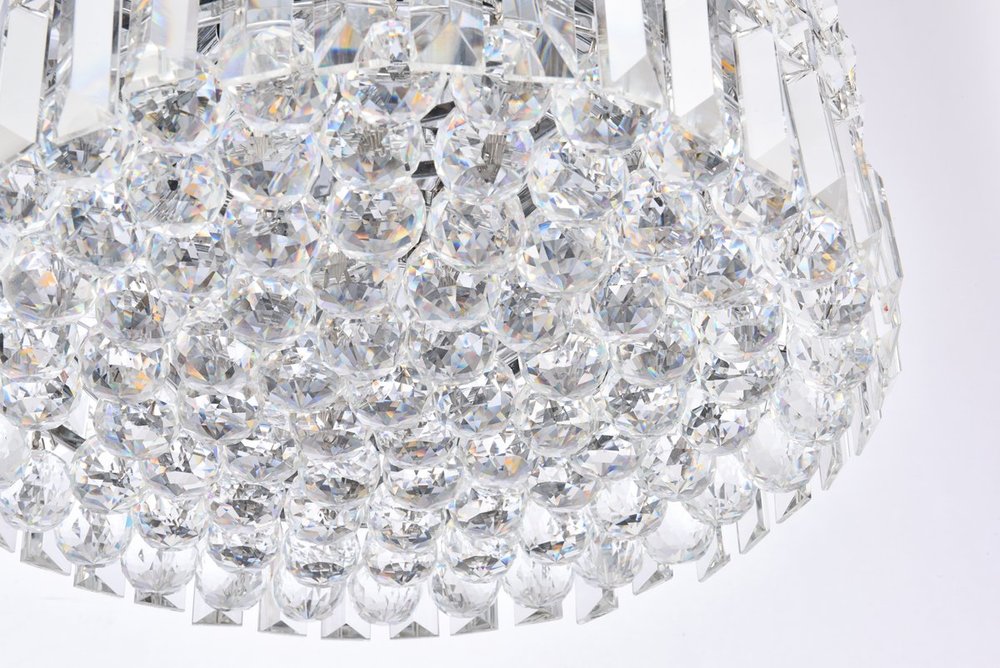 A riot of shapes and textures, Maxime collection flush mounts sparkle in a mosaic of crystal tiles. Square and rectangular precision-cut crystals form the flamboyant exterior while faceted crystal balls create a bubbled effect for light to shine through beneath. Available in a chrome finish with clear crystals, these lamps are a luxurious addition to a kitchen, stairwell, foyer, or living room.