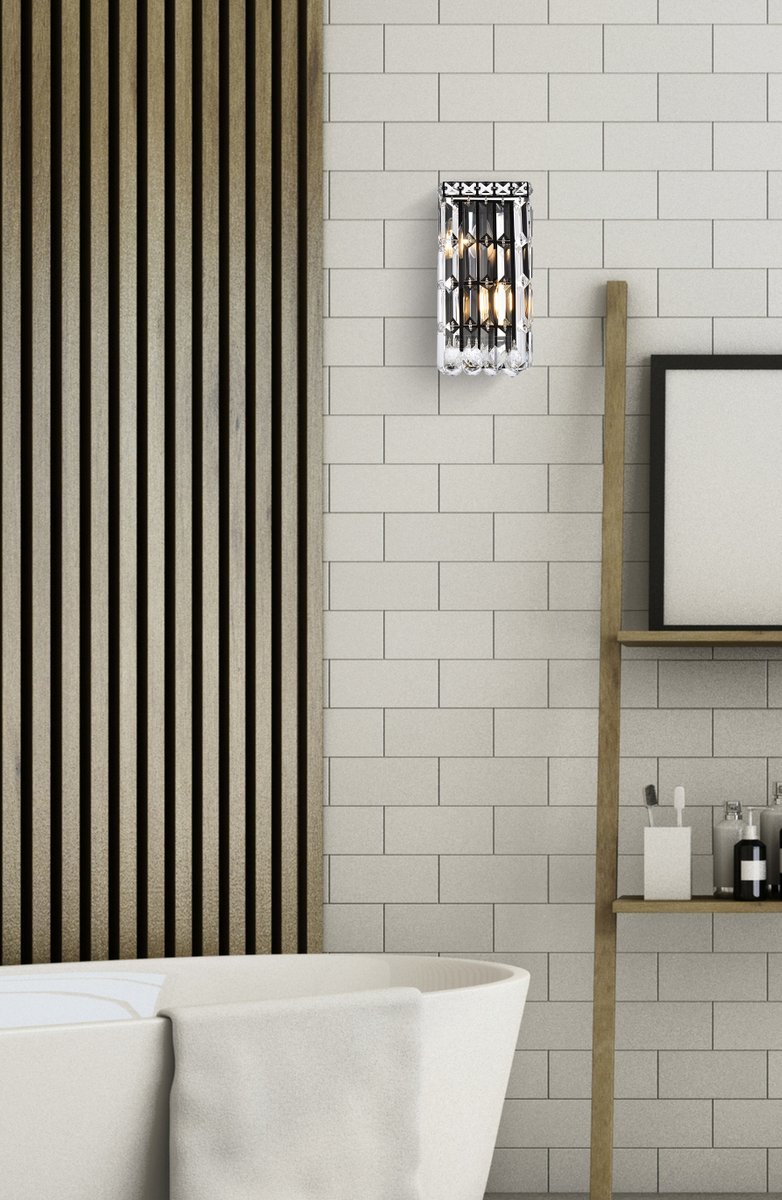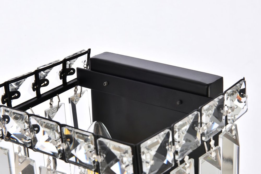 A riot of shapes and textures, Maxime collection wall sconces sparkle in a mosaic of crystal tiles. Square and rectangular precision-cut crystals form the flamboyant semicylindrical or rectangular exterior while faceted crystal balls create a bubbled effect for light to shine through beneath. Available in a black or chrome finish with clear crystals, these lamps are a luxurious addition to a bathroom, entryway, or kitchen.
