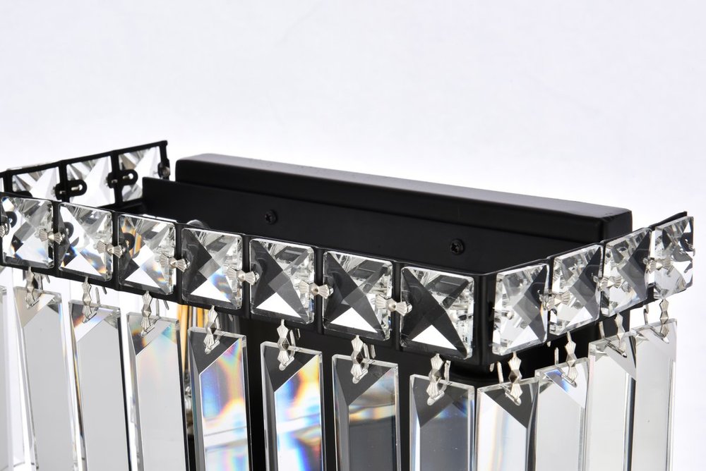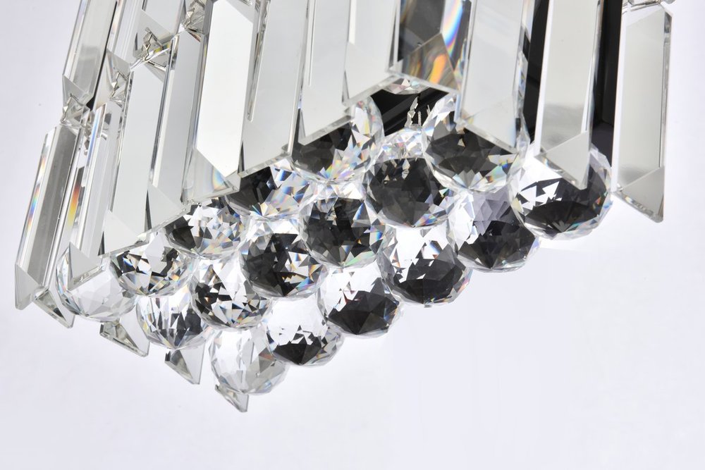 A riot of shapes and textures, Maxime collection wall sconces sparkle in a mosaic of crystal tiles. Square and rectangular precision-cut crystals form the flamboyant semicylindrical or rectangular exterior while faceted crystal balls create a bubbled effect for light to shine through beneath. Available in a black or chrome finish with clear crystals, these lamps are a luxurious addition to a bathroom, entryway, or kitchen.