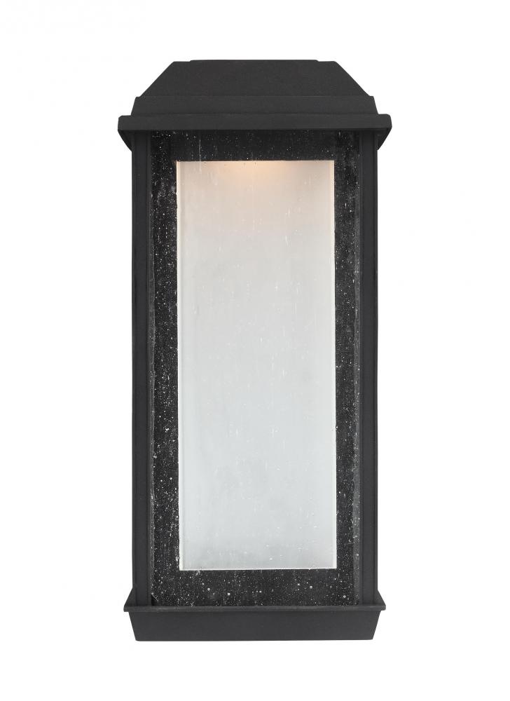 The transitional McHenry lighting collection not only features energy-efficient LED lighting, its made of StoneStrong material for added strength, durability and longevity. All McHenry products feature advanced, warm-on-dim technology with a color temperature that warms when dimmed, from 2700K to 2200K. The fixtures feature panes of Clear Seeded glass which subtly reveal White Opal inner glass, and the framed architectural details complement the chamfered edges of the roof line, all in a Textured Black finish. McHenry has a 5-year warranty, and is recommended for coastal areas.