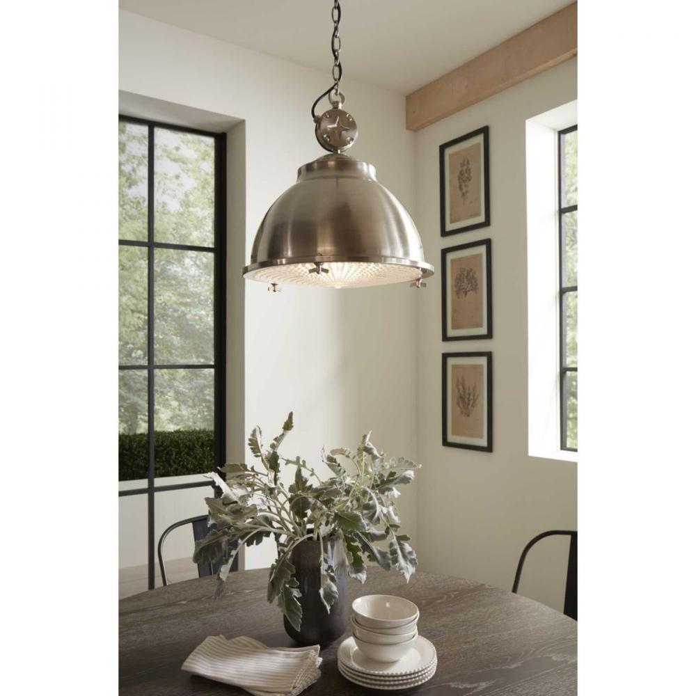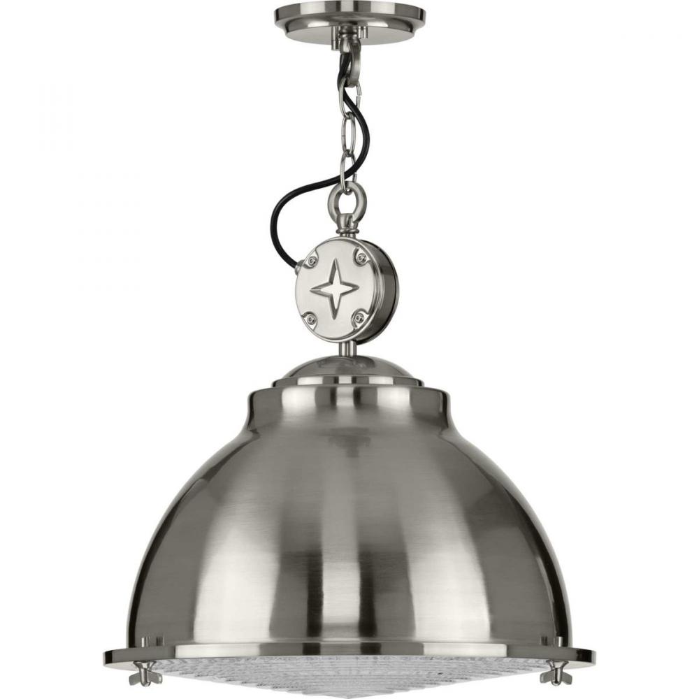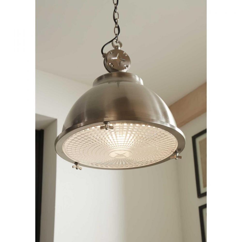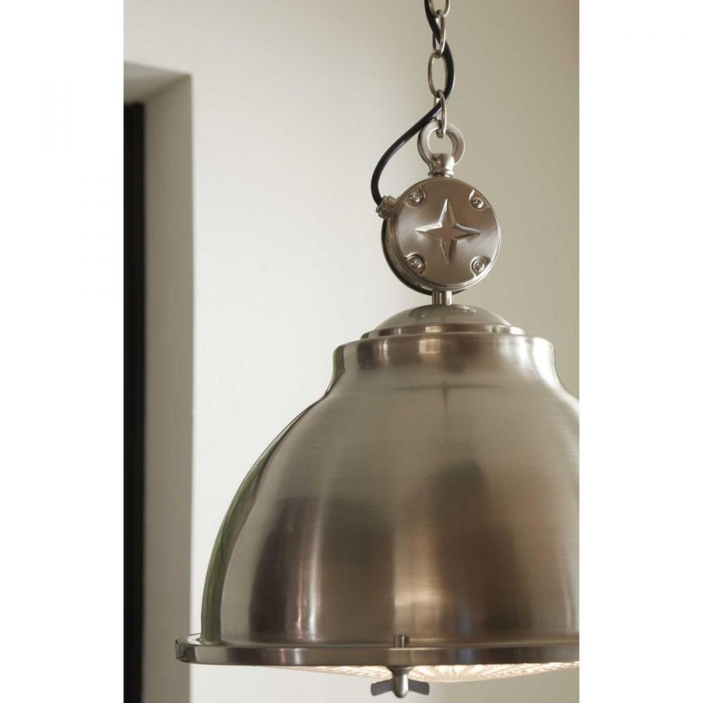 Inspired By Vintage Automobile Engines, This Pendant Boasts A Signature Star Motif For Added Industrial Character. The Smooth Metal Shade Is Coated In A Beautiful Brushed Nickel Finish. The Shade Holds A Prismatic Glass Diffuser Primed For Providing Optimal Task Lighting.