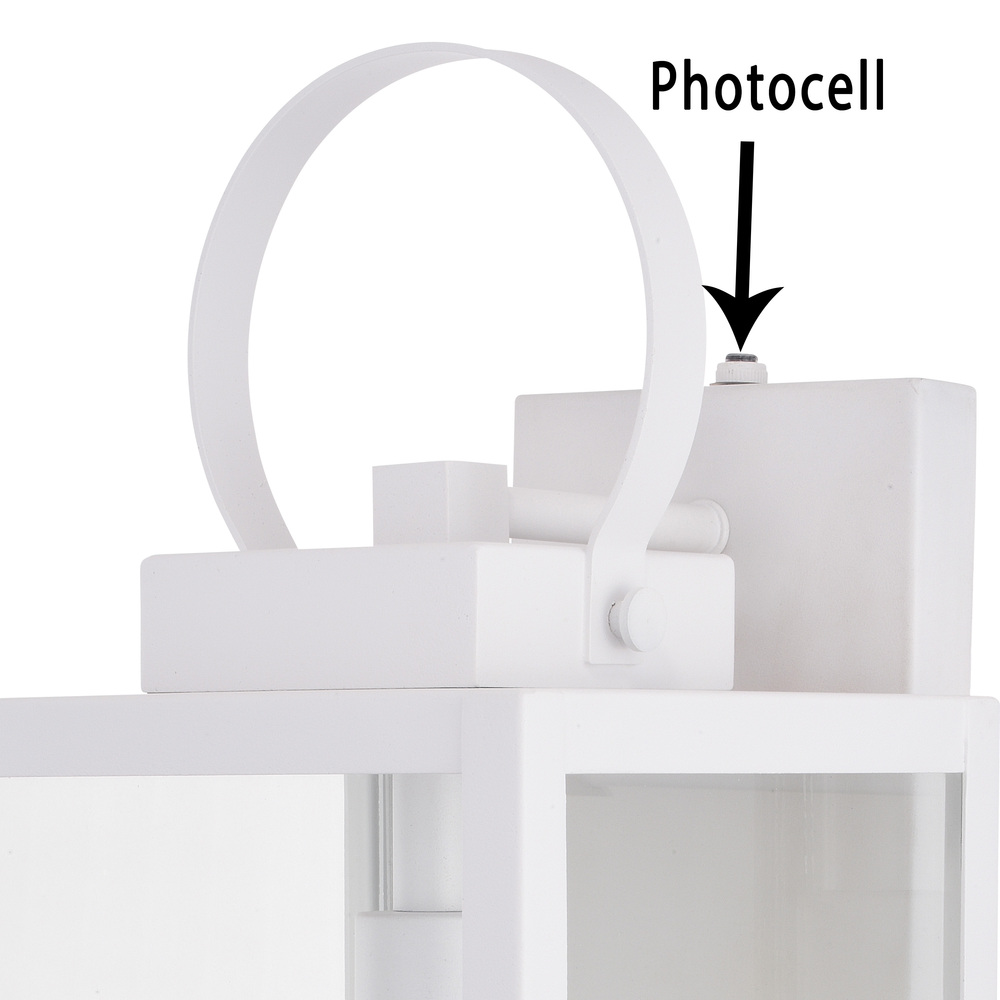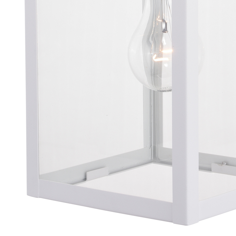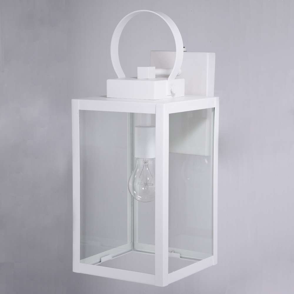 The Medinah is an example of classic minimalist elegance. Large panes of clear glass are framed by textured white frames. The top looped lantern handle adds an additional focal point to the overall design. Combine that with vintage Edison style filament bulbs to complete the look. This outdoor wall light is ideal for your covered porch, entryway, garage, or any other area of your home.