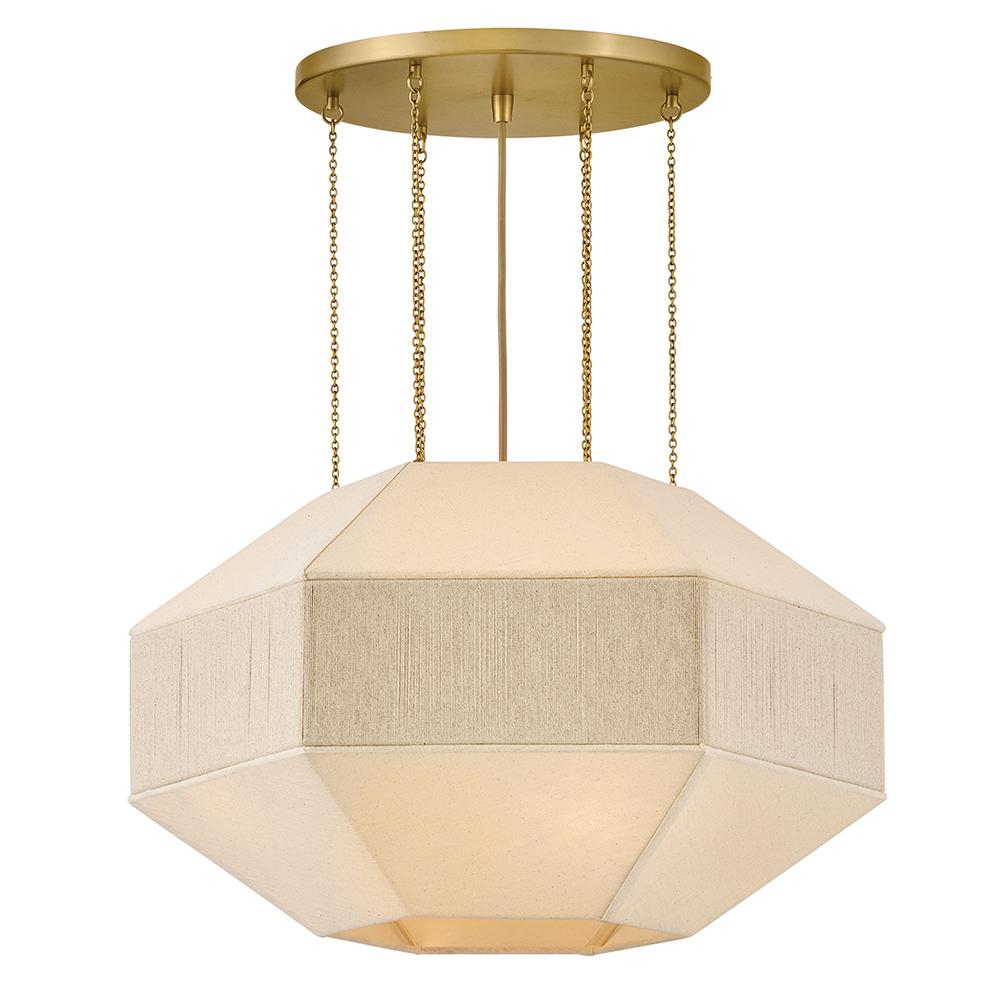 Elegant yet edgy, Lyla’s geometric Oatmeal Linen shade with a textured, wrapped middle band is suspended from refined Lacquered Brass micro-chains – inspired by delicate jewelry designs. A Lacquered Brass canopy and dimmable lamping add subtle warmth and a sophisticated atmosphere to the surrounding space.