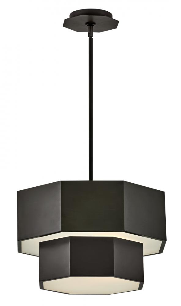 View the many sides of Facet. Interesting angles combine with bold metal features to create an edgy and contemporary profile that is unpretentious yet unforgettable. Hexagonal etched glass is showcased by Heritage Brass or Black Oxide finishes.