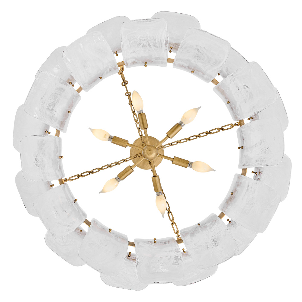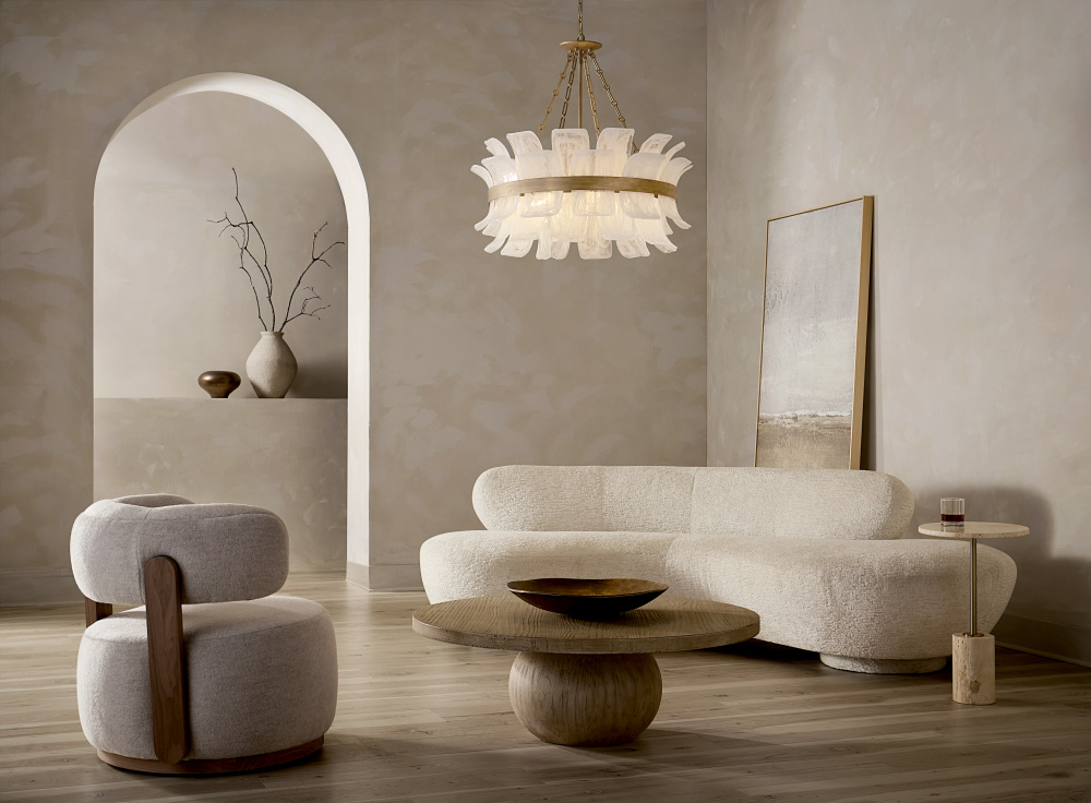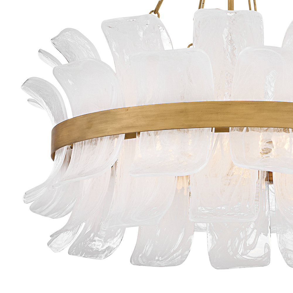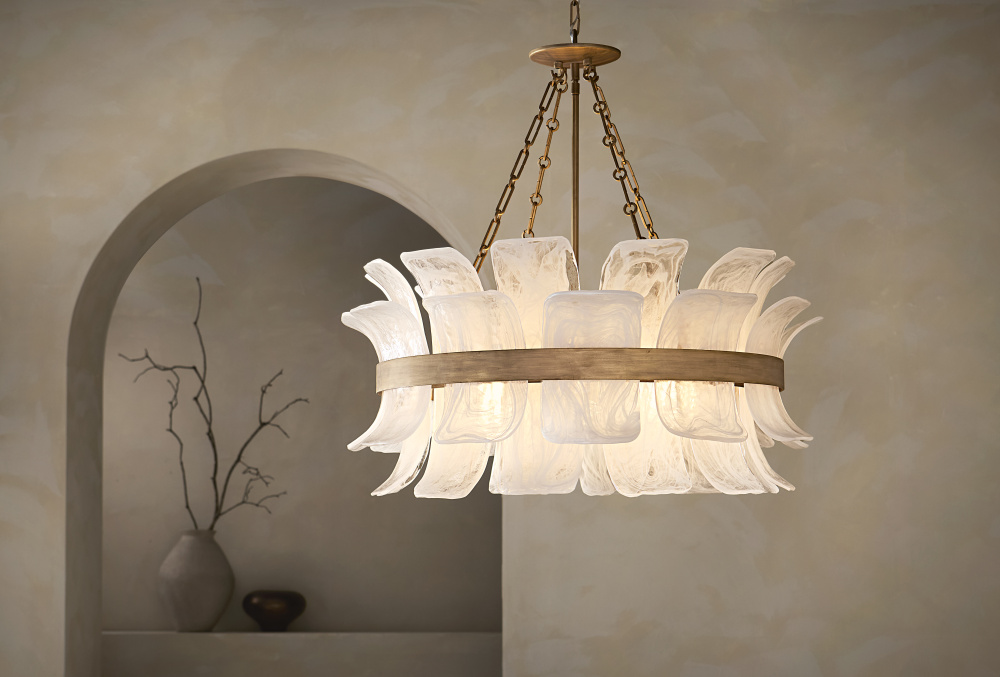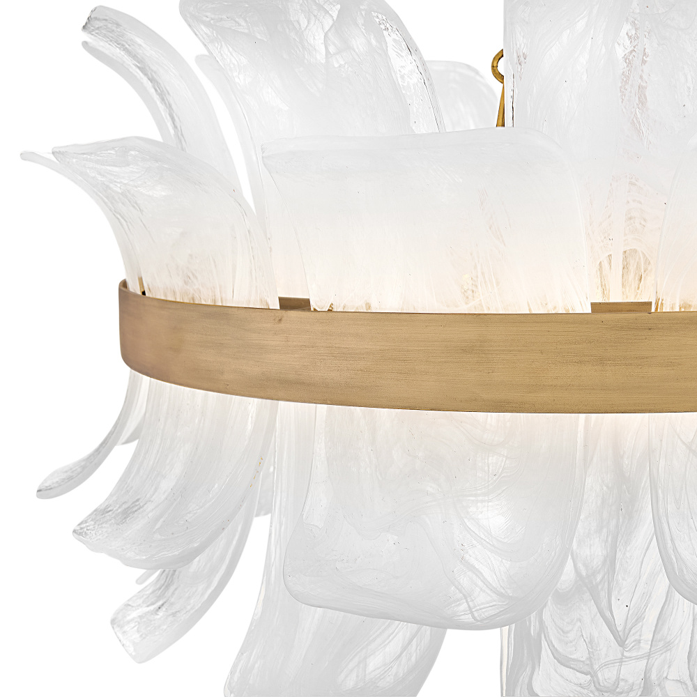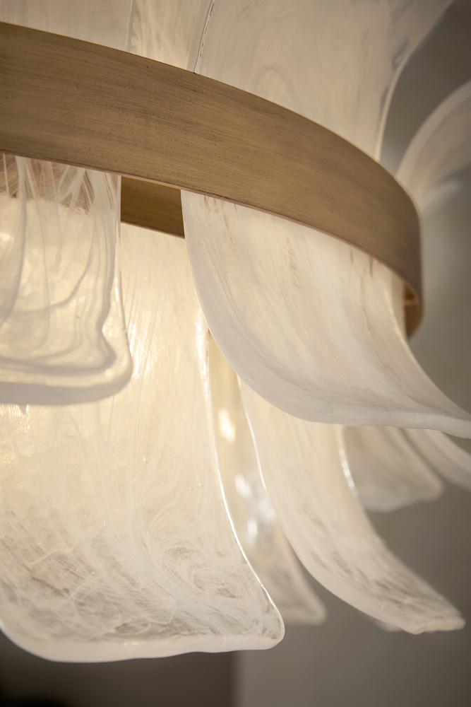 Deftly slumped and artfully arranged sheets of swirled glass appear to unfurl from Fleur’s beautiful drum silhouette, complemented by a central band hand-painted in Burnished Gold. White, cloud-like layers softly diffuse inviting illumination from warm candelabra lamps, creating an enchanting atmosphere.