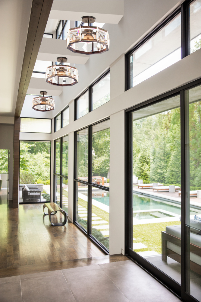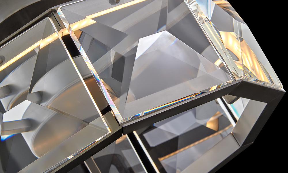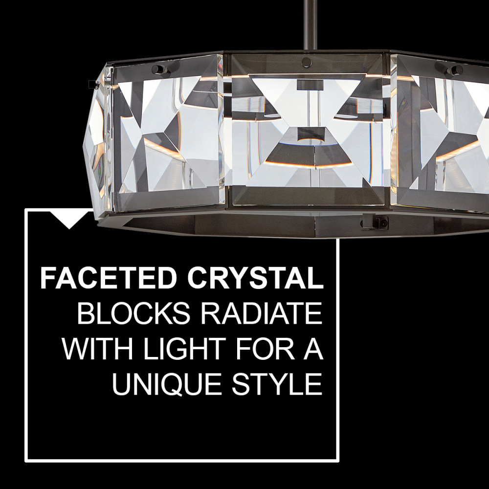 Jolie is a unique blend of sophistication, style, and technology. Integrated LEDs are sleekly concealed within gleaming Heritage Brass rings at the top and bottom of the design. Robust blocks of faceted crystal radiate with light, creating a transfixing silhouette while providing outstanding illumination.