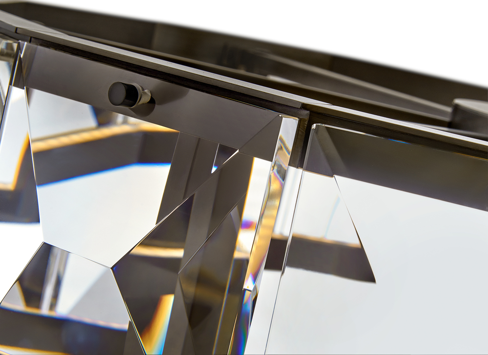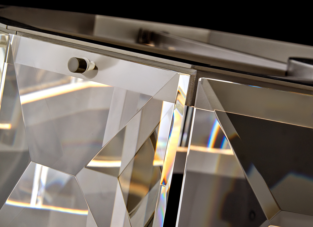 Jolie is a unique blend of sophistication, style, and technology. Integrated LEDs are sleekly concealed within gleaming Heritage Brass rings at the top and bottom of the design. Robust blocks of faceted crystal radiate with light, creating a transfixing silhouette while providing outstanding illumination.