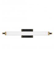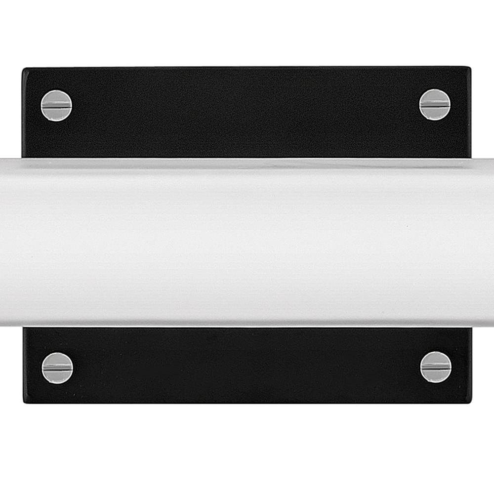 Rollins is both industrial in form and transitional in style. Unique rectangular etched opal glass has softly rounded edges offset by contrasting details on the backplate and the square knobs anchoring either end. This integrated LED design comes in two finish combinations, Black with Chrome and Black with Heritage Brass, and can be hung both vertically and horizontally.
