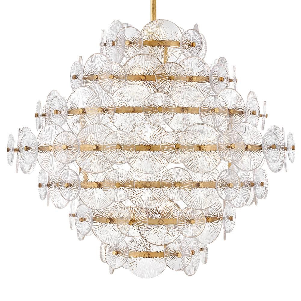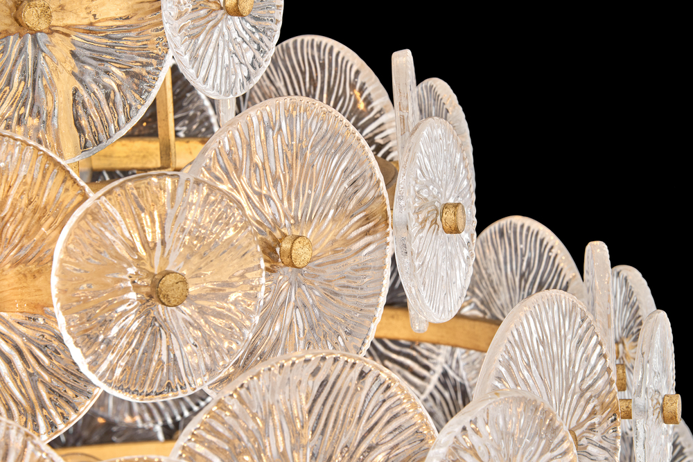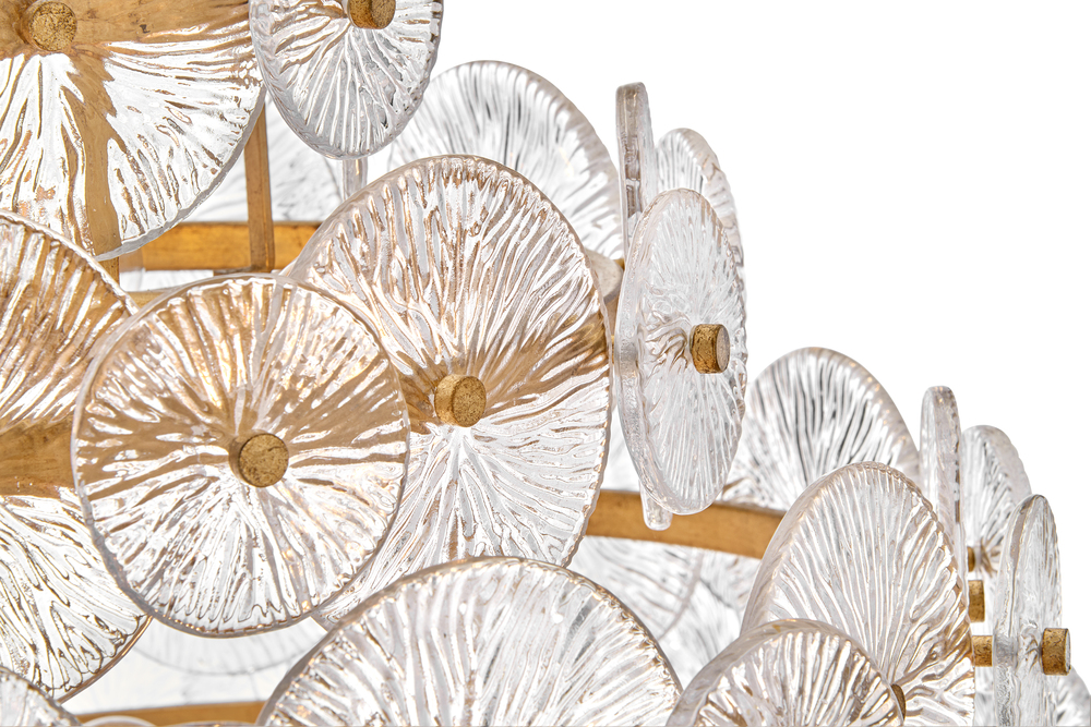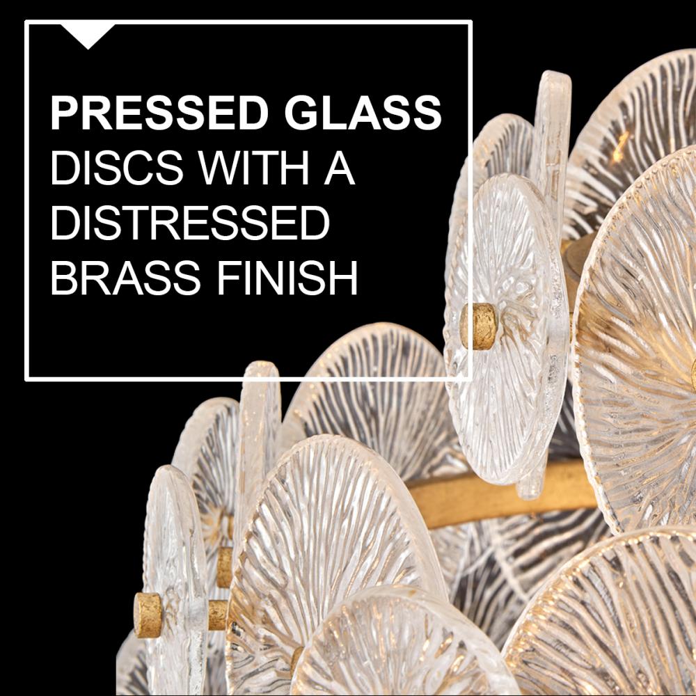 Rene radiates light through multiple layers of beautiful, pressed glass disks. Rene’s signature touch highlights a Distressed Brass finish, evoking both transitional and glam influences.