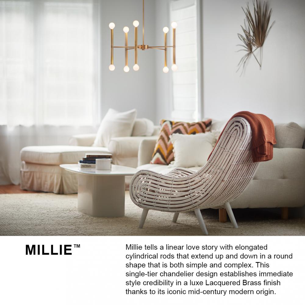 Millie tells a linear love story with elongated cylindrical rods extending outwards, creating a sleek statement that commands attention. This design establishes immediate style credibility thanks to its iconic midcentury modern origin, ensuring visual intrigue in either Black or Lacquered Brass finishes. To complement Millie's chic style, we recommend G16.5 bulbs.