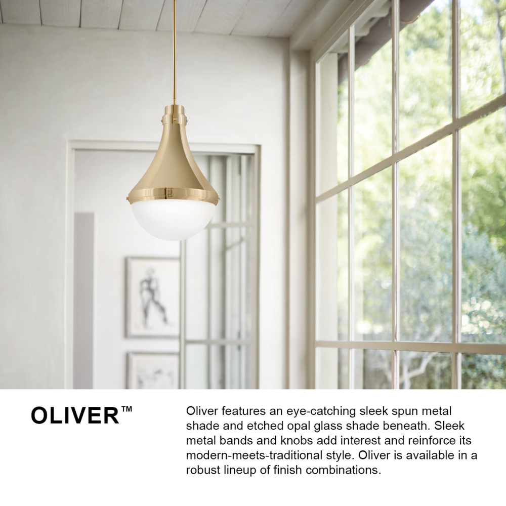 Oliver features an eye-catching sleek spun metal shade and etched opal glass shade beneath. Sleek metal bands and knobs add interest and reinforce its modern-meets-traditional style. Oliver is available in a robust lineup of finish combinations.