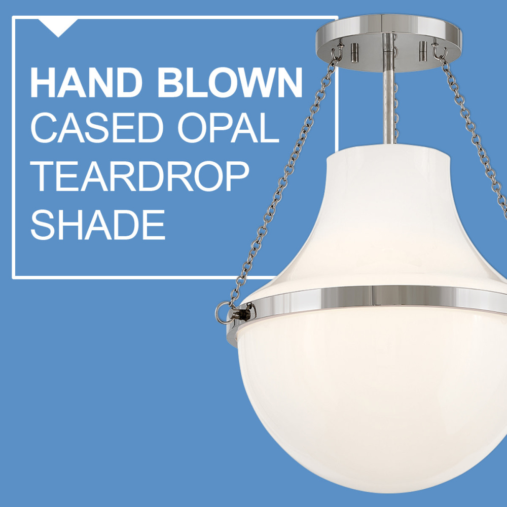 Fusing a sculpted, modern form with classically styled details, Collins features a transitional teardrop shade crafted from blown, cased opal glass. A central metal band and delicate chain uprights are available in Heritage Brass or Black Oxide finishes.