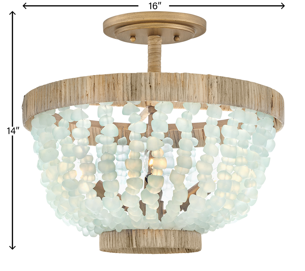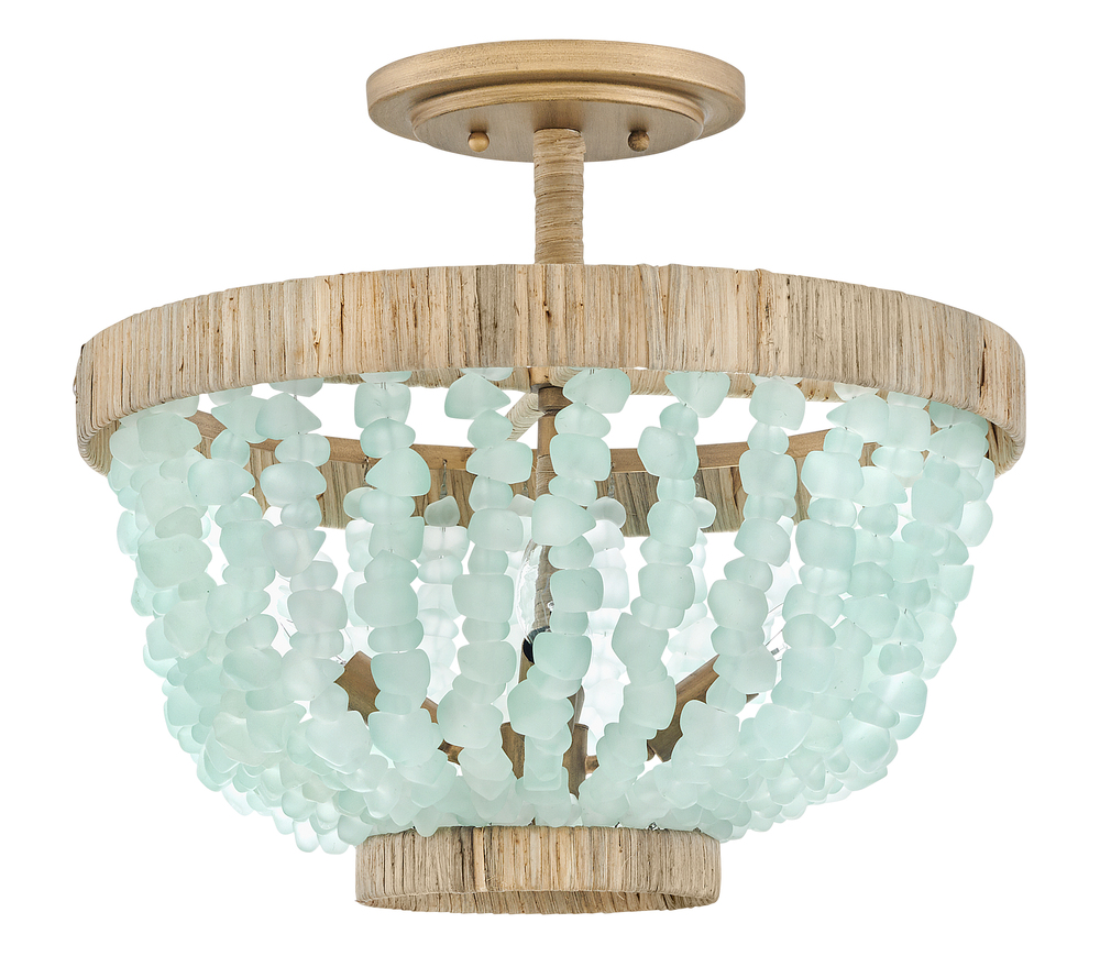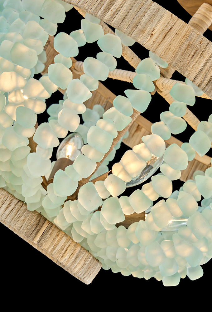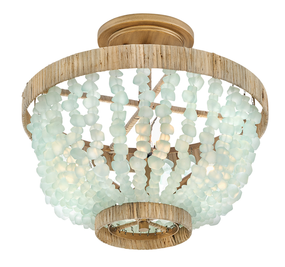 Dune's bohemian chic design showcases strands of soft sea glass combined with a Burnished Gold finish. The designs blend a sophisticated silhouette with organic elements inspired by sun and surf. Dune infuses any space with timeless, mesmerizing elegance.