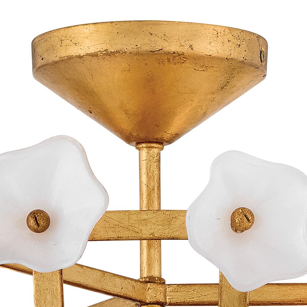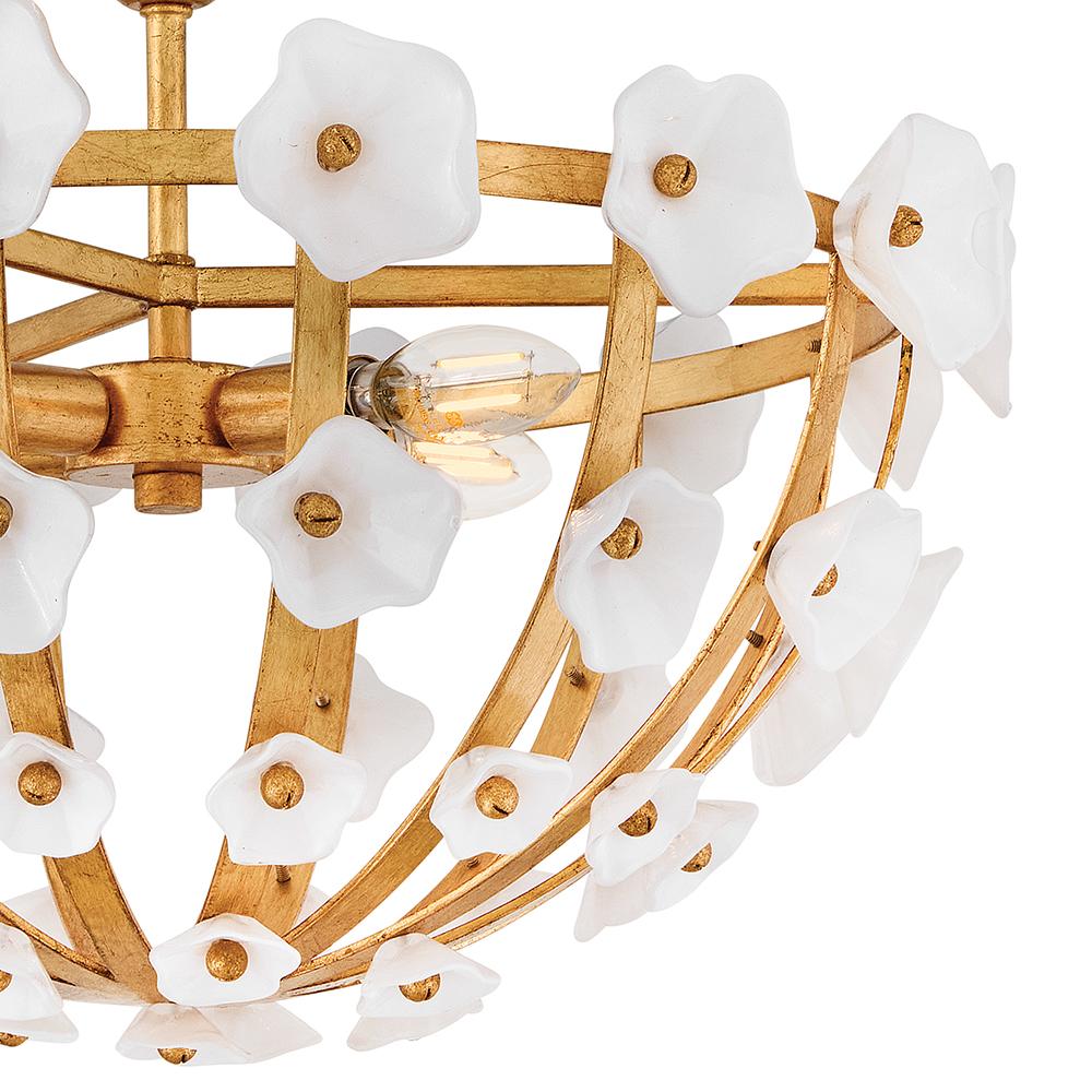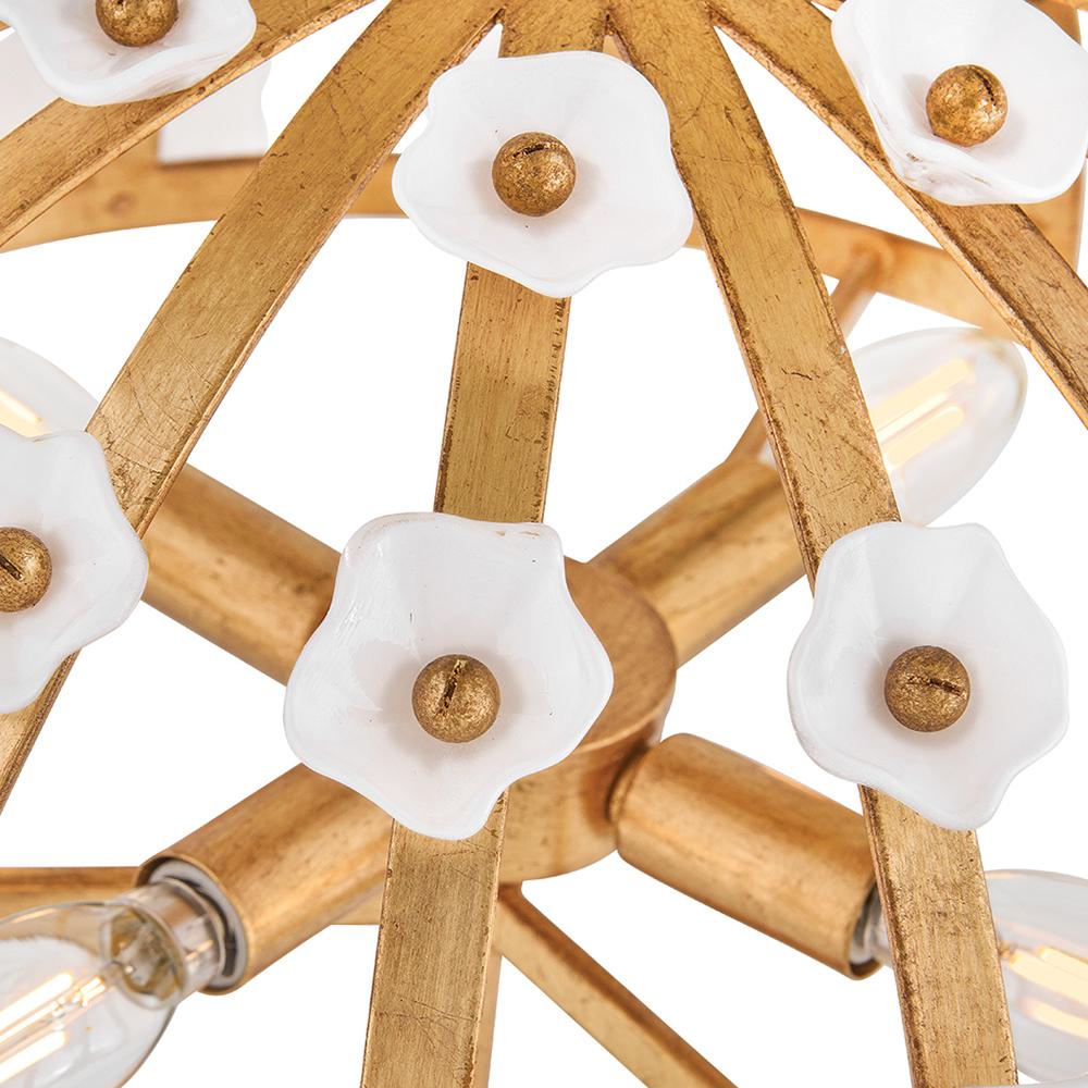 Inspired by the natural romance of annual spring blooms, Azalea’s intricate silhouette is adorned with double-layered glass blossoms crafted from clear and white glass. A Distressed brass frame complements an abundance of warm, ambient illumination from dimmable candelabra lamps.