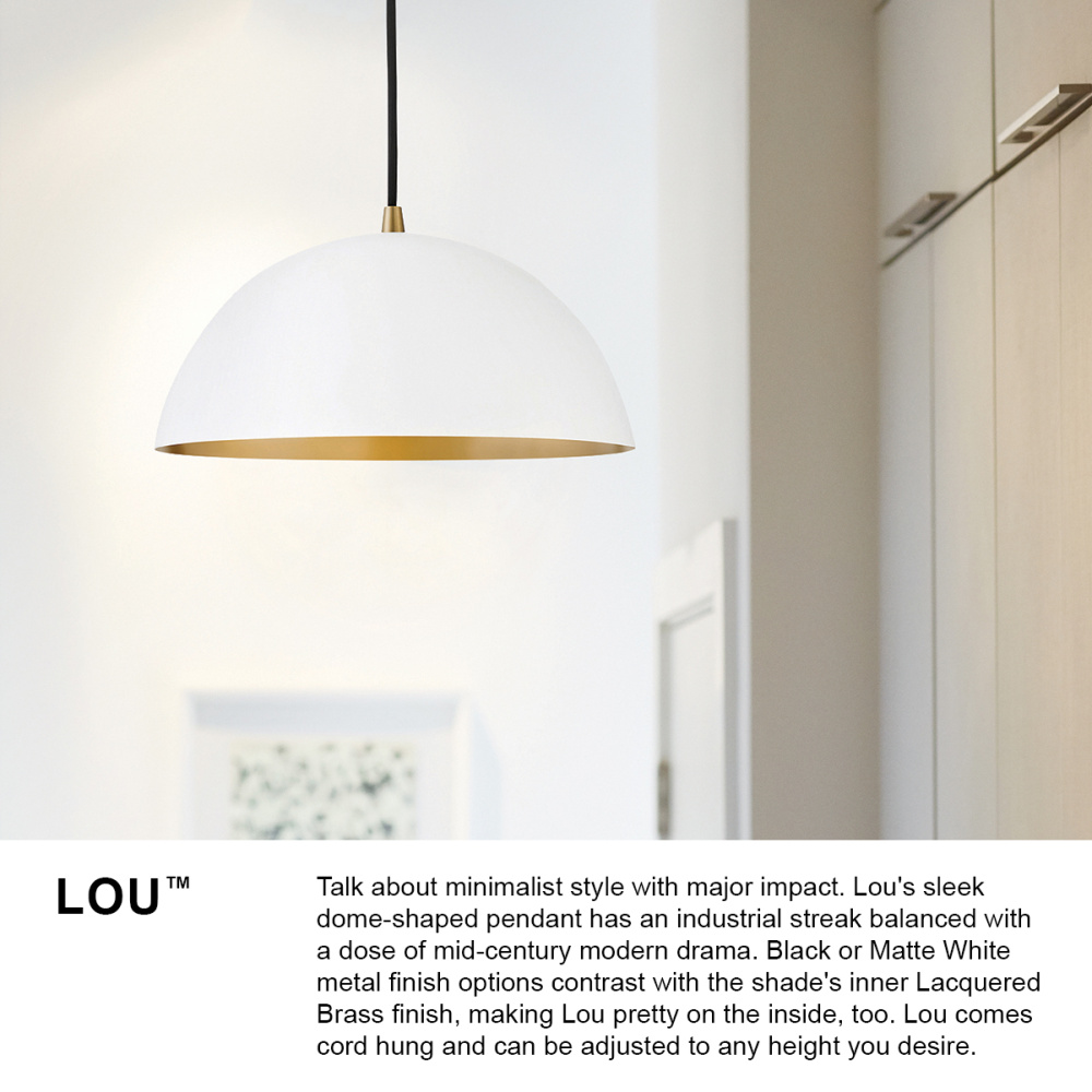 Talk about minimalist style with major impact. Lou’s sleek dome-shaped pendant has an industrial streak balanced with a dose of mid-century modern drama. Black or Matte White metal finish options contrast with the shade’s inner Lacquered Brass finish, making Lou pretty on the inside, too. Lou comes cord hung and can be adjusted to any height you desire.