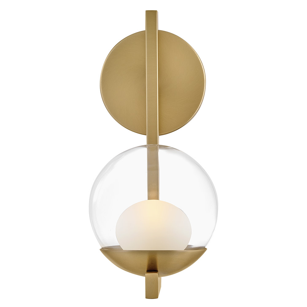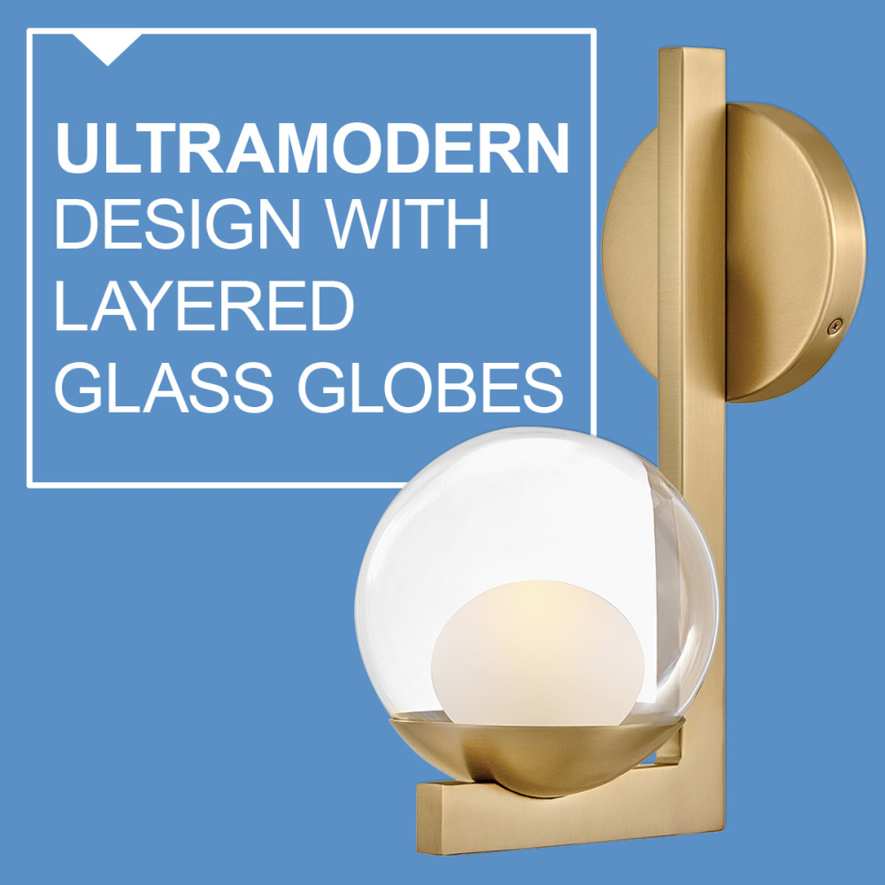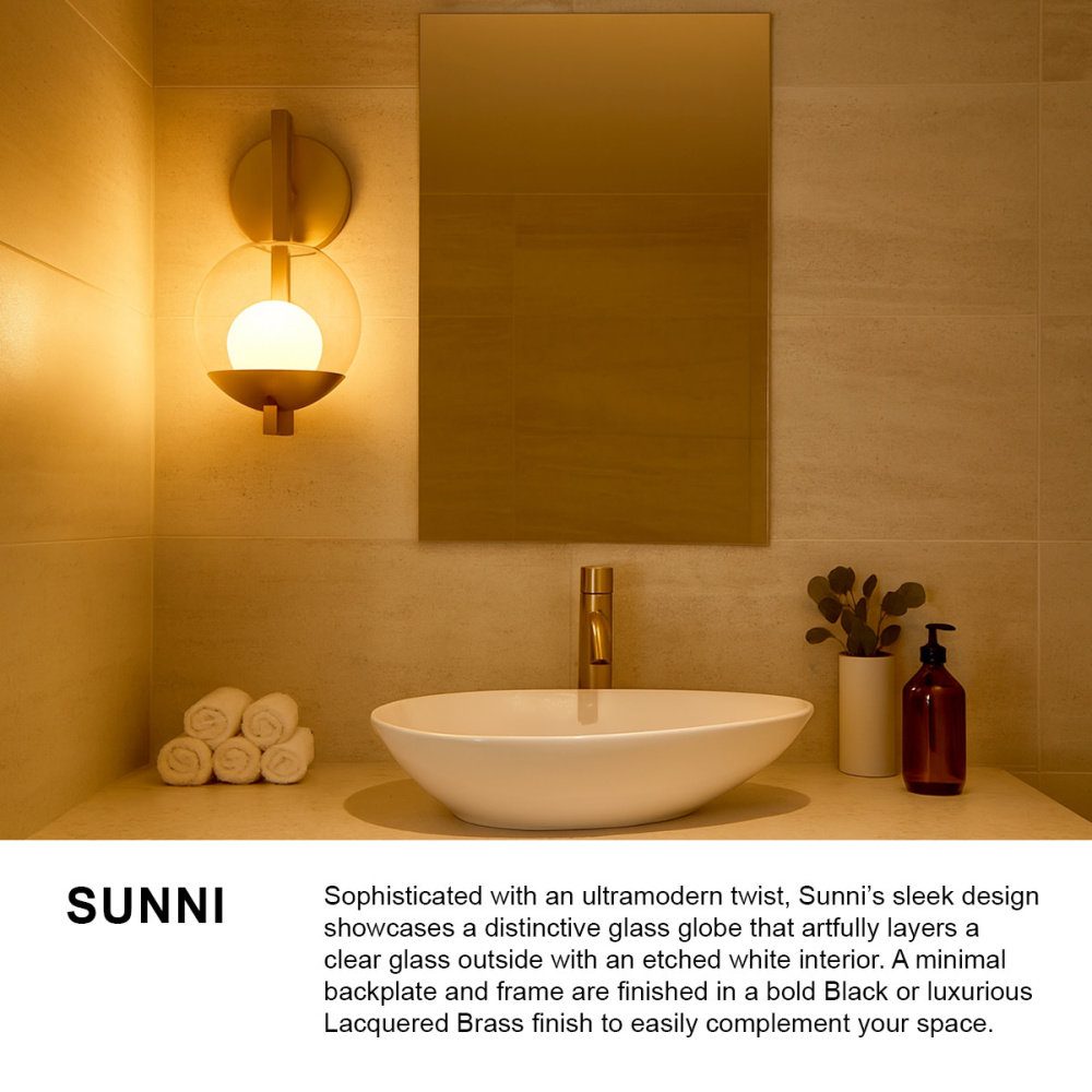 Sophisticated with an ultramodern twist, Sunni’s sleek design showcases a distinctive glass globe that artfully layers a clear glass outside with an etched white interior. A minimal backplate and frame are finished in a bold Black or luxurious Lacquered Brass finish to easily complement your space.