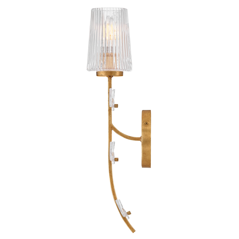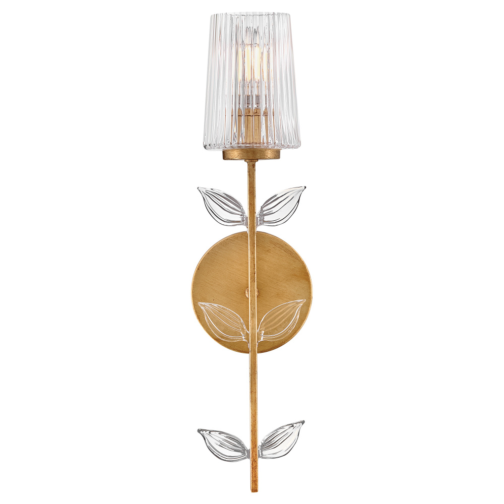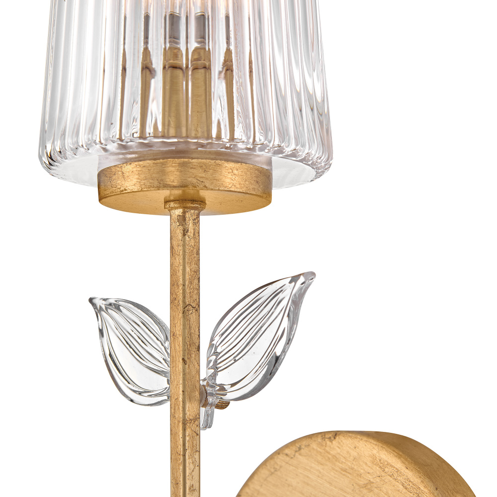 Feminine and romantic, Aliso’s thin, delicate frame is adorned with dainty, clear, pressed glass leaves. A hand-painted Distressed Brass finish enhanced by gold leaf makes a polished and luxurious statement in both traditional and modern settings