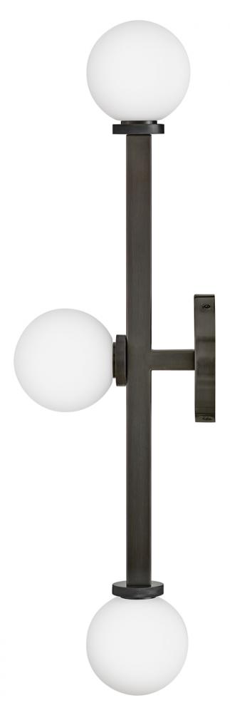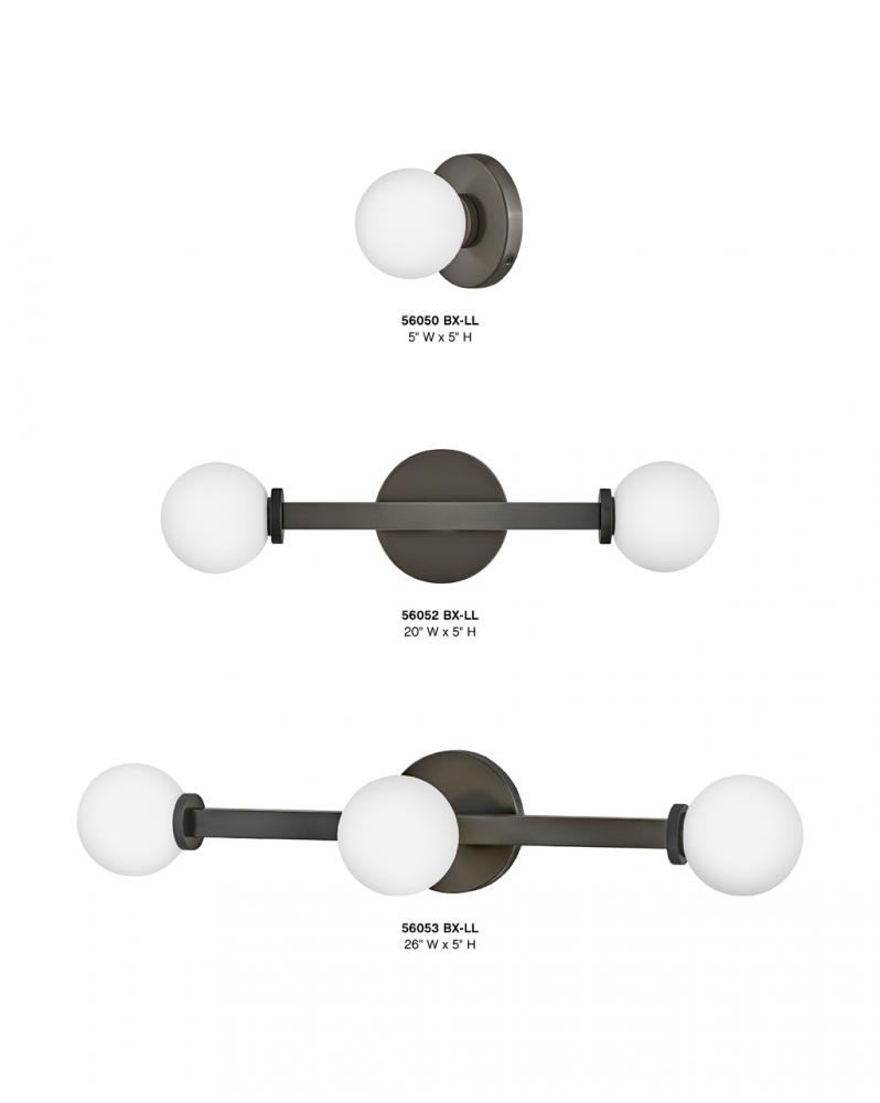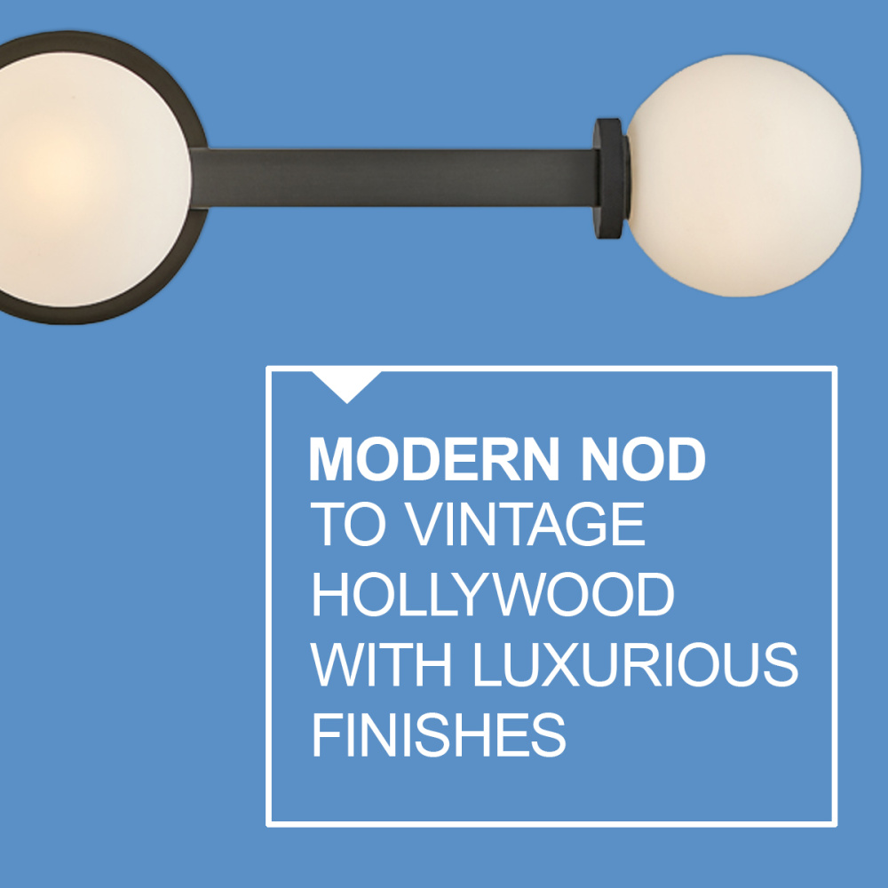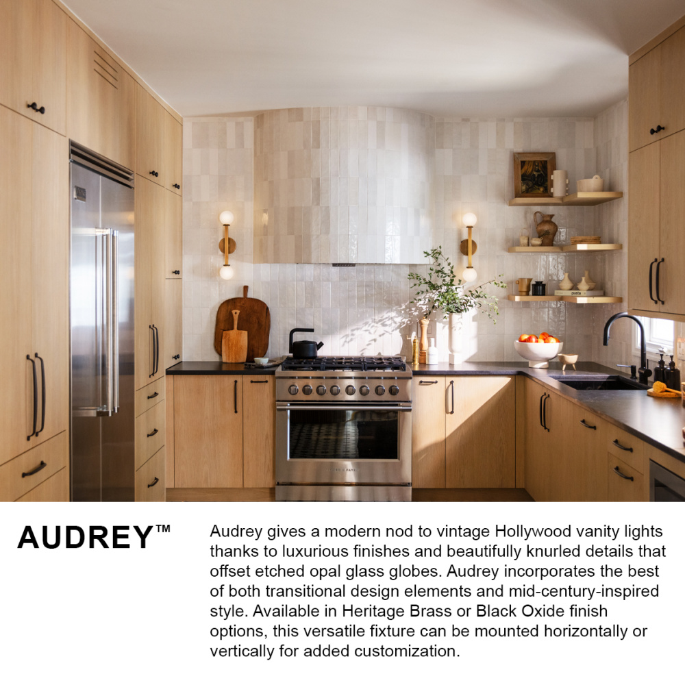 Audrey gives a modern nod to vintage Hollywood vanity lights thanks to luxurious finishes and beautifully knurled details that offset etched opal glass globes. Audrey incorporates the best of both transitional design elements and mid-century-inspired style. Available in Heritage Brass or Black Oxide finish options, this versatile fixture can be mounted horizontally or vertically for added customization.
