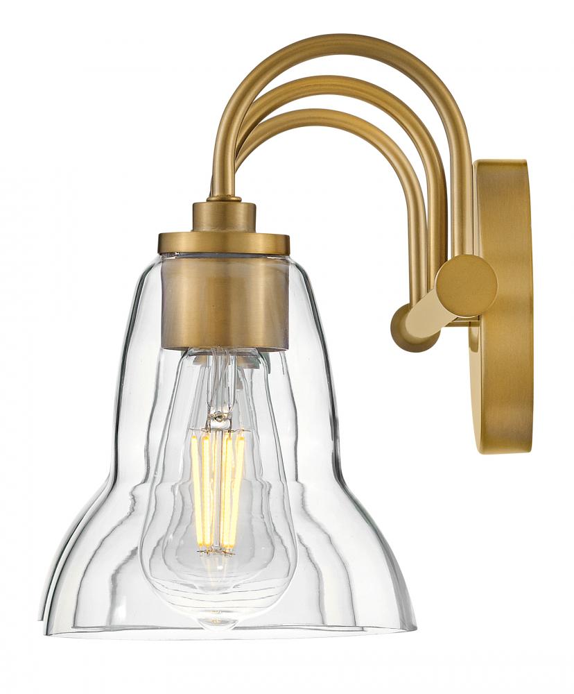 Vera’s unique, shapely form takes the traditional bell-shaped shades to a new level. Plenty of light shines up or down from the clear glass, making it a functional choice for main baths and powder rooms alike. Finished in Black or Lacquered Brass, Vera’s chic profile brings transitional style to any space.