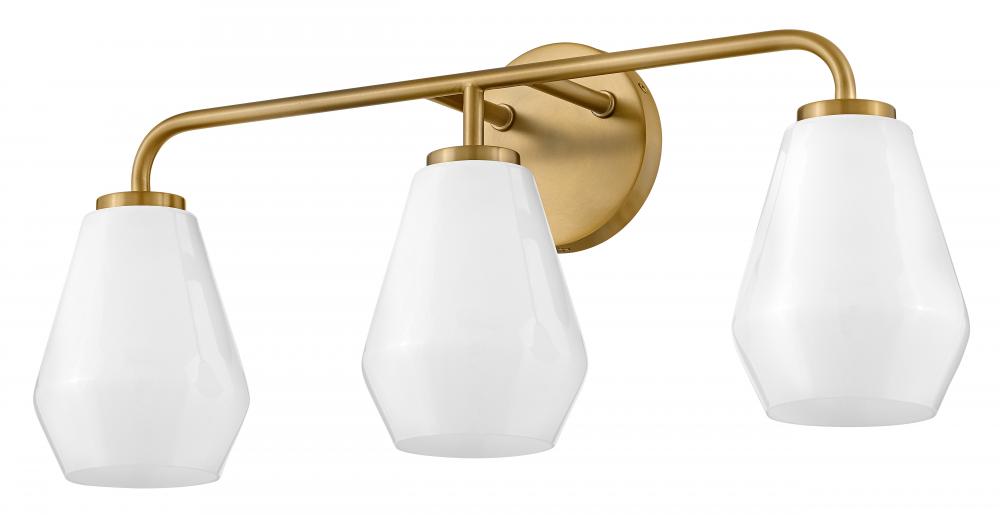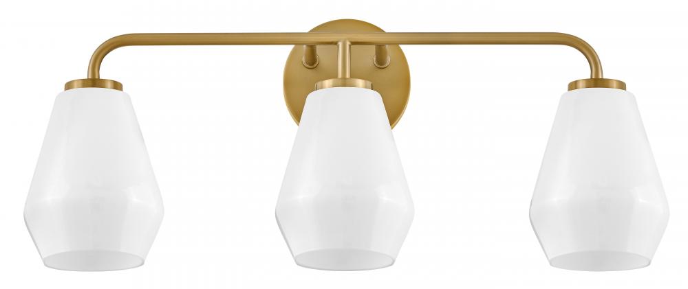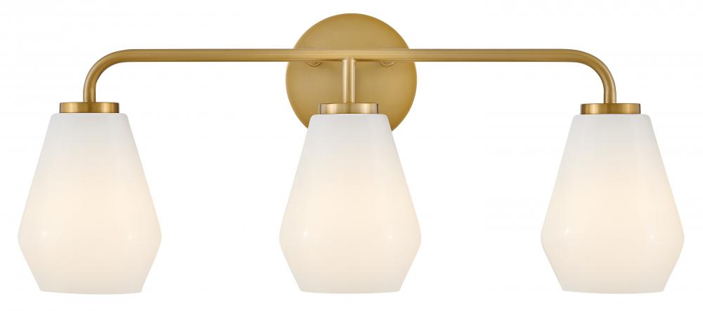 Subtle geometric elements find harmony within the sleek, curved lines of Gio. The cased opal glass covers the space in functional, diffused light while providing a nice contrast to the bold variety of finish colors. Gio’s transitional glam design and clean profile add to any bath décor.
