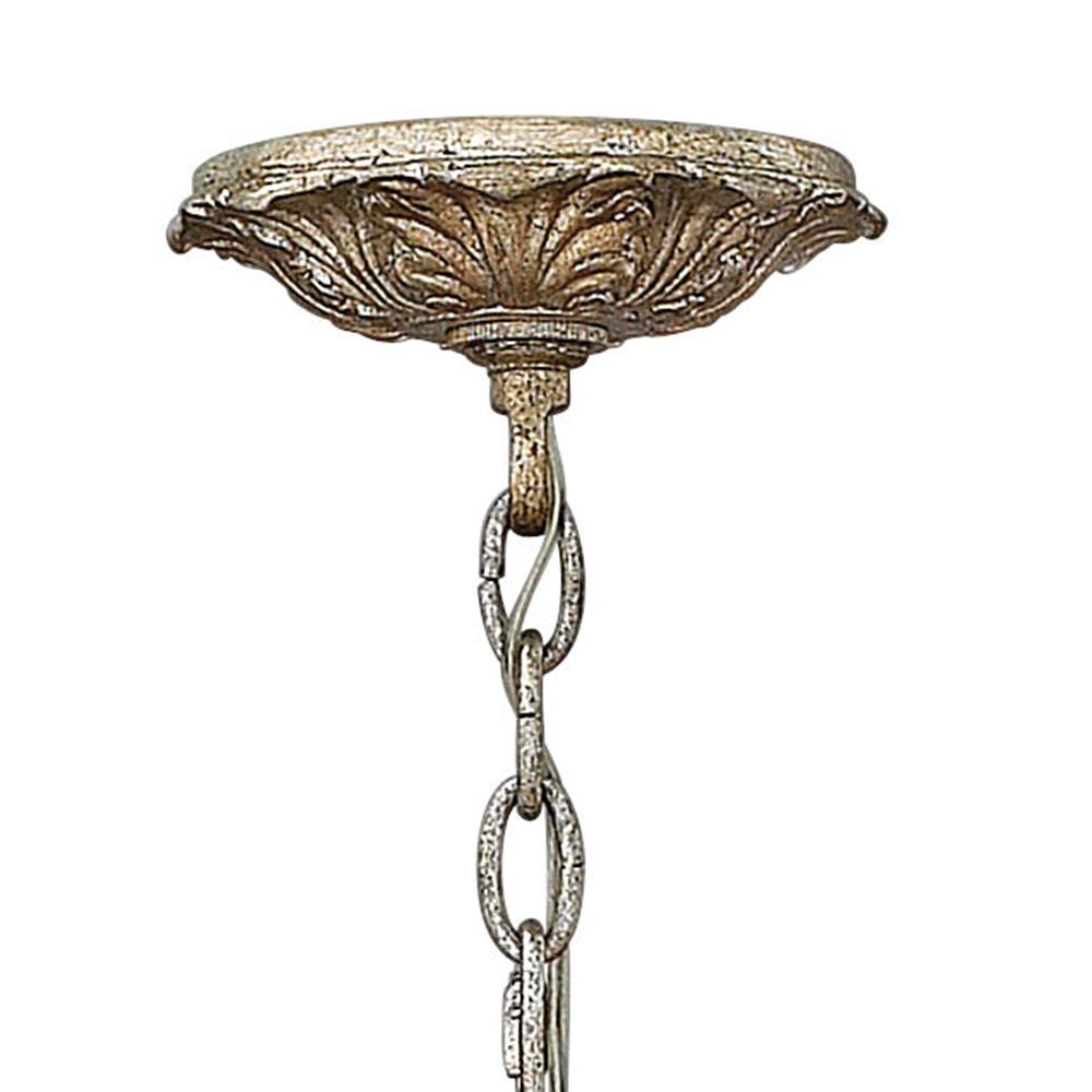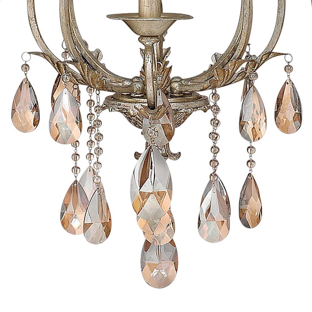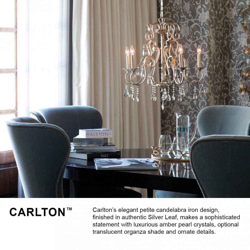 Carlton's elegant petite candelabra iron design, finished in authentic Silver Leaf, makes a sophisticated statement with luxurious amber pearl crystals, optional translucent organza shade and ornate details.