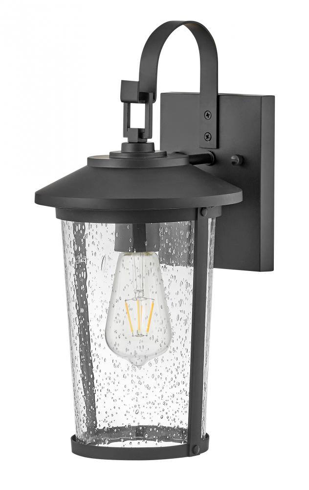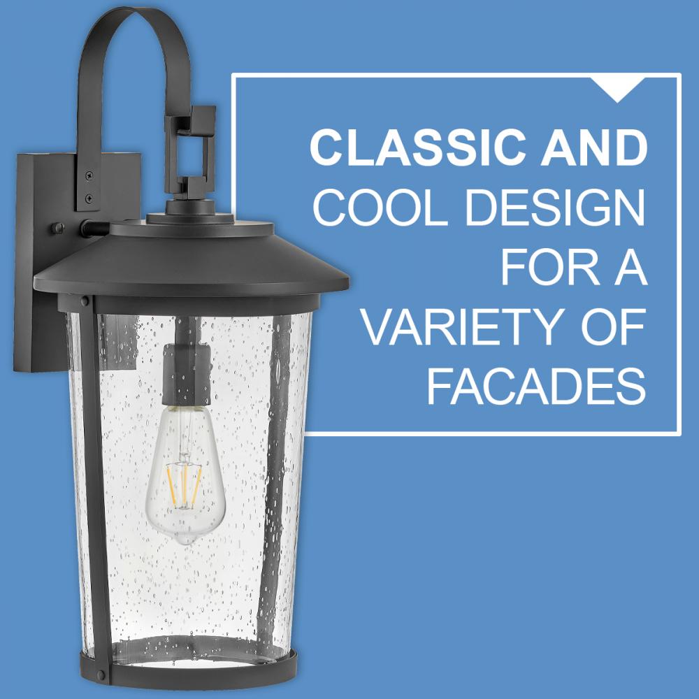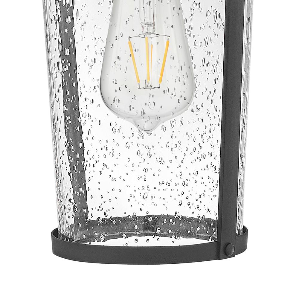 Classic and cool design elements merge in this vintage-inspired transitional 1-light outdoor lantern. Banks flaunts its substantial tapered clear seedy glass, captured in a dashing Black frame, to deliver a versatile vibe with a hint of European cool to complement a variety of facades.