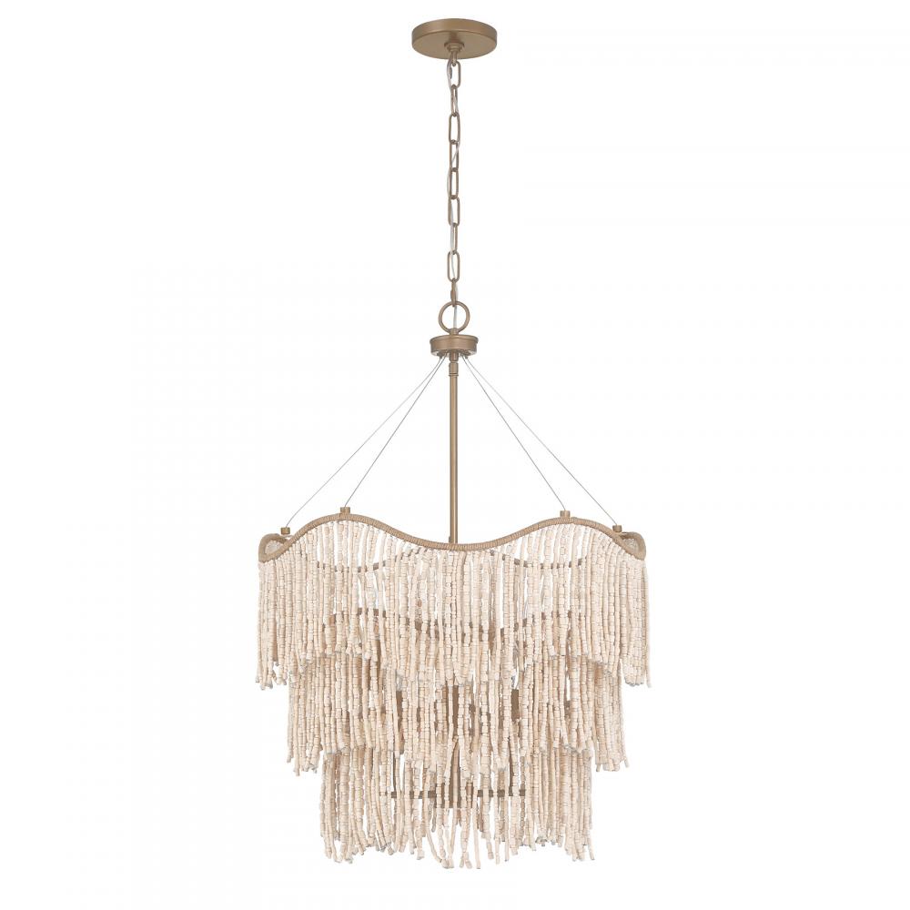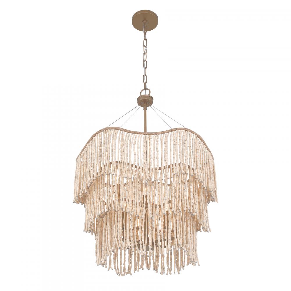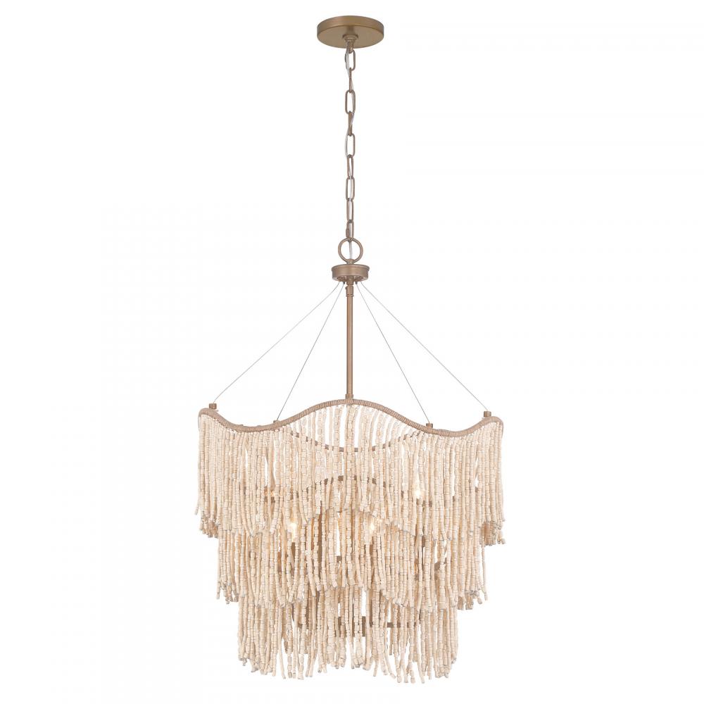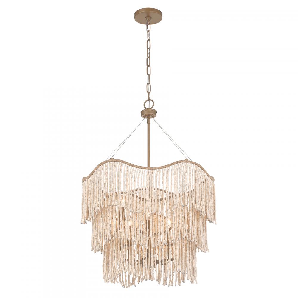 The relaxed yet ravishing Savoy House Melia 6-light pendant was designed by Breegan Jane, an award-winning interior designer and TV host. It is named for and inspired by one of her favorite Parisian hotels. Melia flaunts a softly curving three-tiered structure finished in Cypress and decorated with rows of intricately strung wood beads that remind us of the strength that femininity can hold. The terrifically touchable texture makes it a standout selection for any space. Melia is 31.5" in height and 22" in width. It uses six candelabra size bulbs of up to 60 watts per bulb. Bulbs not included. Comes with 120" of chain.