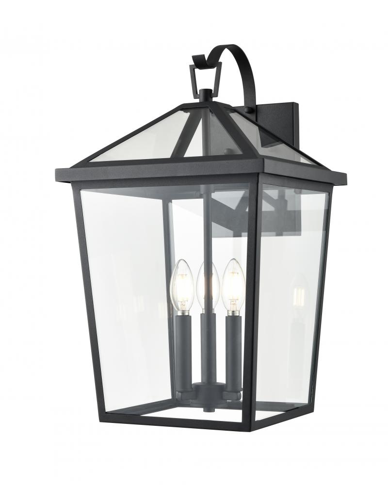 The Mensun Collection of outdoor sconces is characterized by its archetypal Georgian era form with a tapered silhouette and capped with an open canopy, allowing maximum illumination. Available as 1-light, 2-light and 3-light options, the fixtures are finished in textured black and intended to create a stately presence, lighting common areas or flanking entryways and garages.