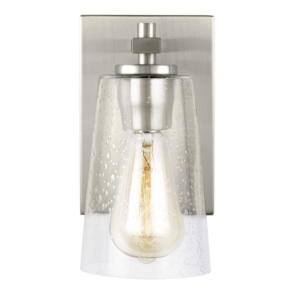 The Sean Lavin Mercer one light wall sconce in satin nickel offers shadow-free lighting in your powder room, spa, or master bath room. Modern details, like the clean square supports of the cross arm and sleek, rectangular backplate, are defining features of the Mercer. Choose from either refreshingly bright Chrome or warm, rustic Oil Rubbed Bronze hardware for a distinct look, both with tapered Clear Seeded glass shades that complete the tailored look.