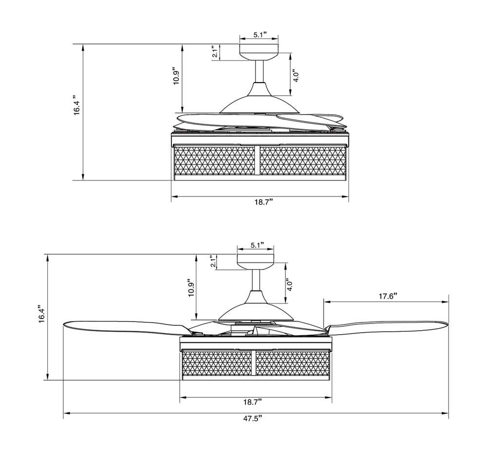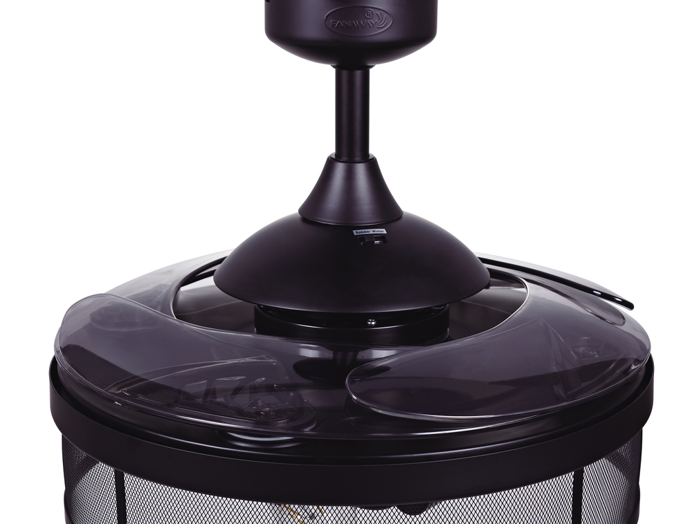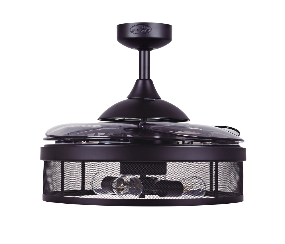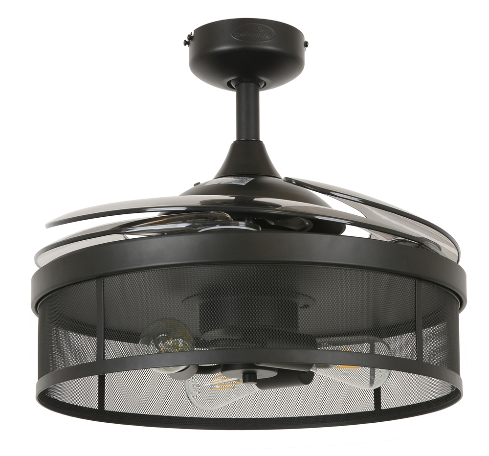 The Australian Original FANAWAY Meridian Black with Smoke Blades is an advanced ceiling fan with unique aesthetics and energy-efficient design. Switched off, the traditionally intrusive fan blades automatically retract and conceal, transforming the unit into a modern industrial pendant. It creates open space in the room environment, accumulates less dust, and is unobtrusive and versatile to visually integrate into all rooms of your home. The fan comes with 3 dimmable LED vintage bulbs, 3-speed remote control, winter/summer mode and wall mount for you to personalize your experience. The star of this Fanaway design is the light kit which has a hand-crafted industrial mesh cage. The 3 dimmable vintages LED bulbs completes the rustic modern feel and is sure to add that designer look to any room in your home. Additional downrods lengths sold separately: 12", 24" and 36" – 51106012, 51106018, 51106024, 51106036. US Patent 8317470, US Patent 8807938, US Patent 8790085, US Patent 9255584, US Patent 8851841.Features:Set includes: One (1) ceiling fan with remote control. Material: Metal (fan housing) and PC - Polycarbonate (blades). Finish: Black. Ceiling fan dimensions: 16.54 inches high x 48 inches wide x 48 inches deep. Blade dimensions: 17.7 inches length x 4.1 inches width; Blade color: Smoke. Summer/Winter mode: Yes. Motor size (inch): D153 x 15. Airflow(CFM): 4172.69. Number of speed: 3. Power Consumption Average(wattage): 60. Motor Wattage: 60W. Include 3 x 4.5W E26 Based ST19 LED bulbs included; each bulb 360LM, 2700K. Socket: E26; Dimmable. RPM H/M/L (motor speed): 223/163/122. Fan Watts when used at high speed: 60W. Voltage: 110V. This product will ship to you in one (1) box.Accessories pictured are NOT included.Assembly required.