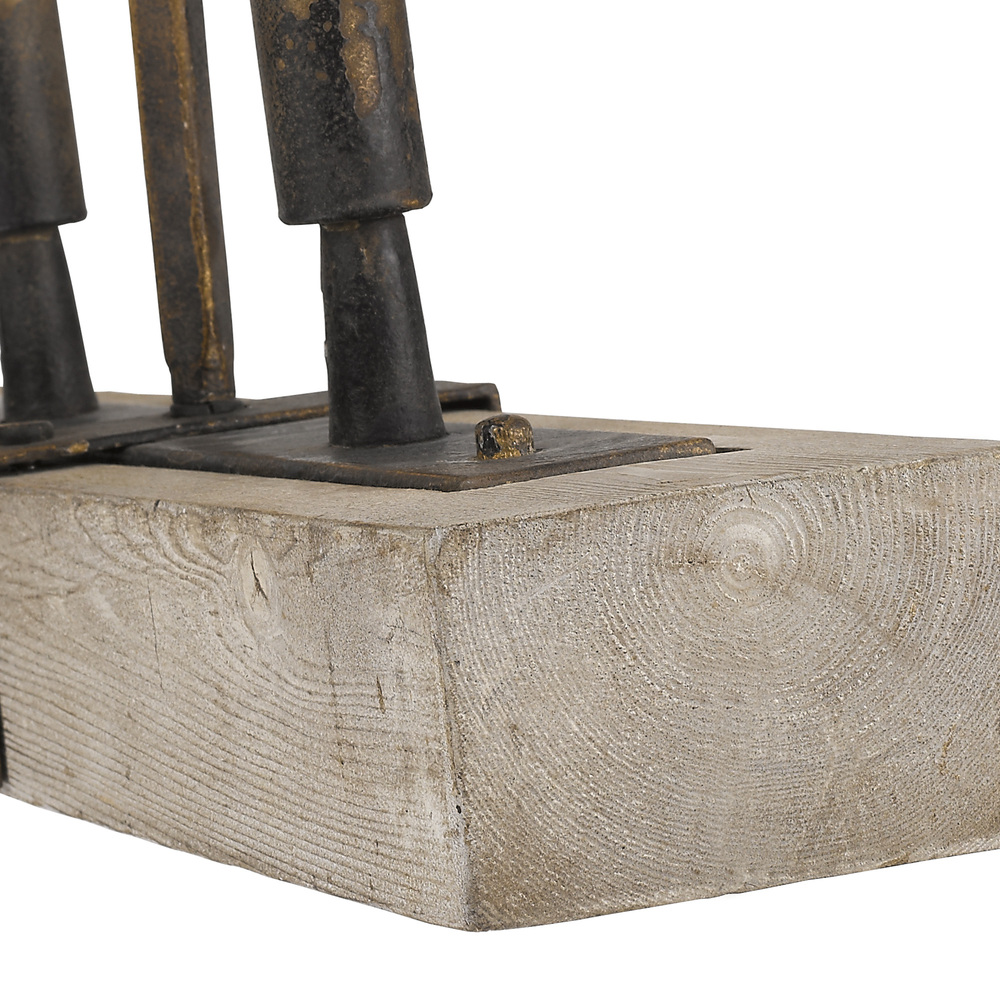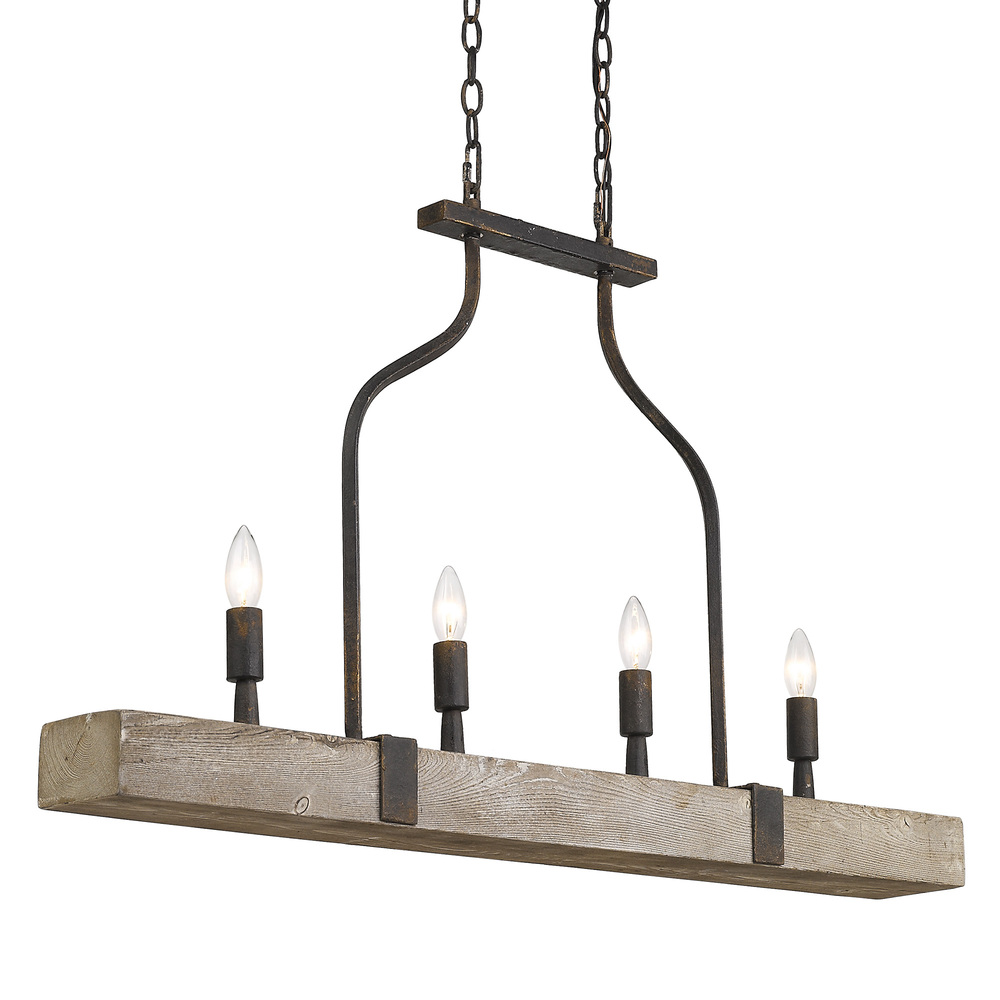 True to its roots, Meyer is a rustic-inspired design that features authentic wood elements. The fixtures are hoisted into the air by a sturdy metal frame and matching chains in an antique black iron finish. The dark finish is applied to the hardware that secures the natural fir wood to the frame. Tall candelabras command attention from the top of the raw wood beam. Installation by chains allows this linear pendant to be installed on a sloped ceiling.