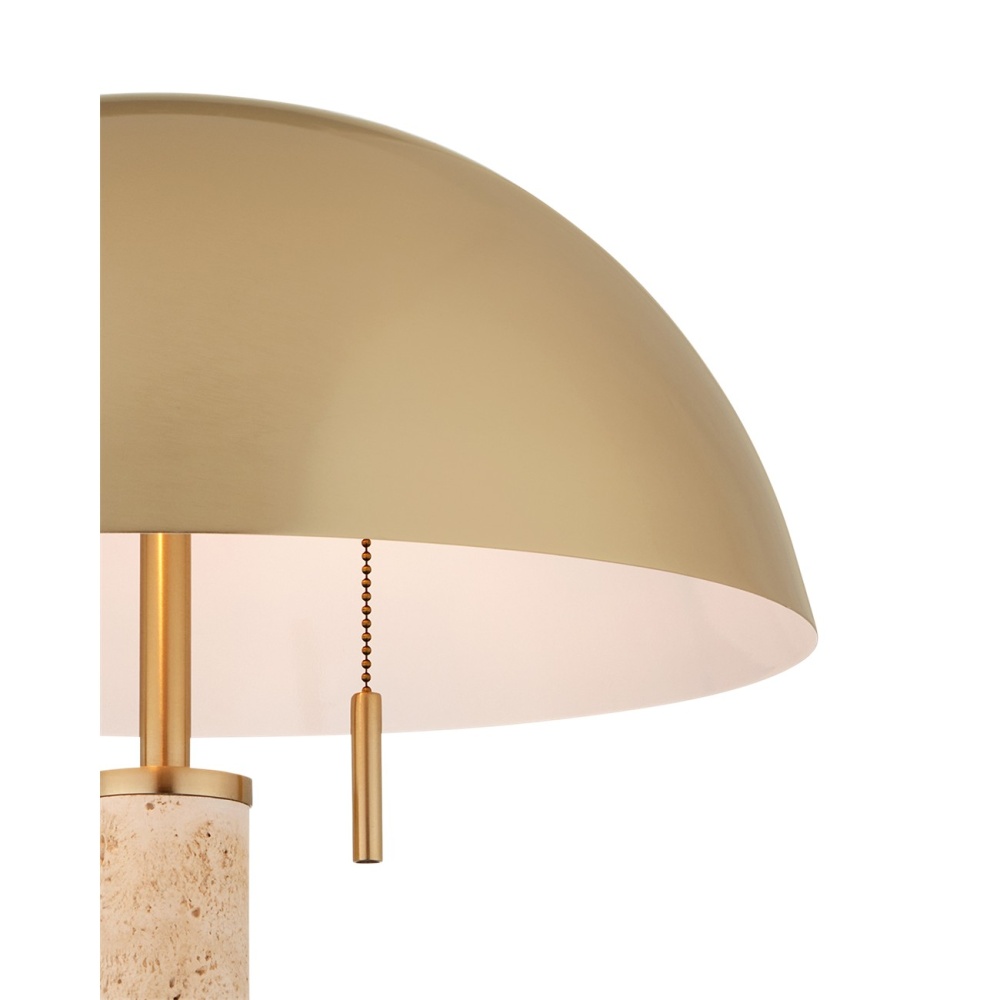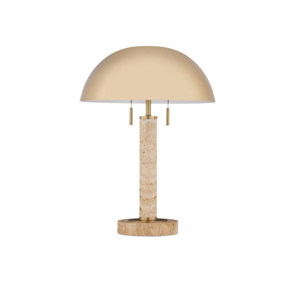 The Miles Table Lamp is a travertine lamp inspired by other pieces with the same name. The mid-century modern vibe is enhanced by the simple shapes of the lamp's base and body, and the domed brass shade that caps it. Because this beige lamp is made of natural stone, texture and color may vary from lamp to lamp.